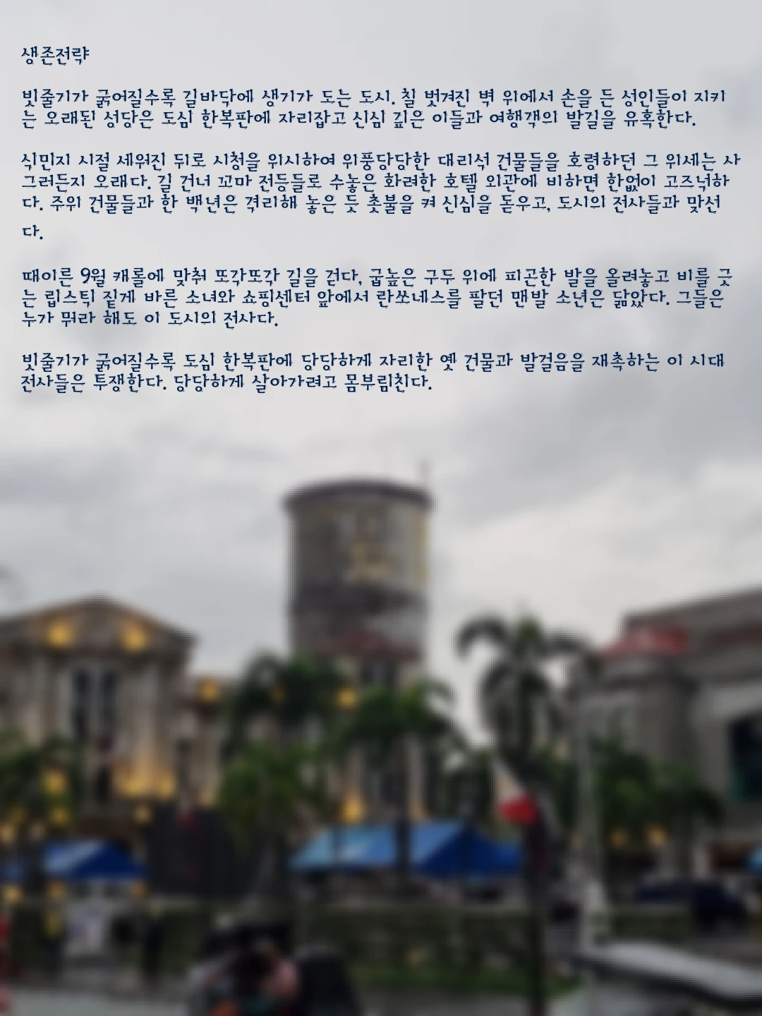 빗줄기가 굵어질수록 도심 한복판에 당당하게 자리한 옛 건물과 발걸음을 재촉하는 이 시대 전사들은 투쟁한다. 당당하게 살아가려고 몸부림친다.