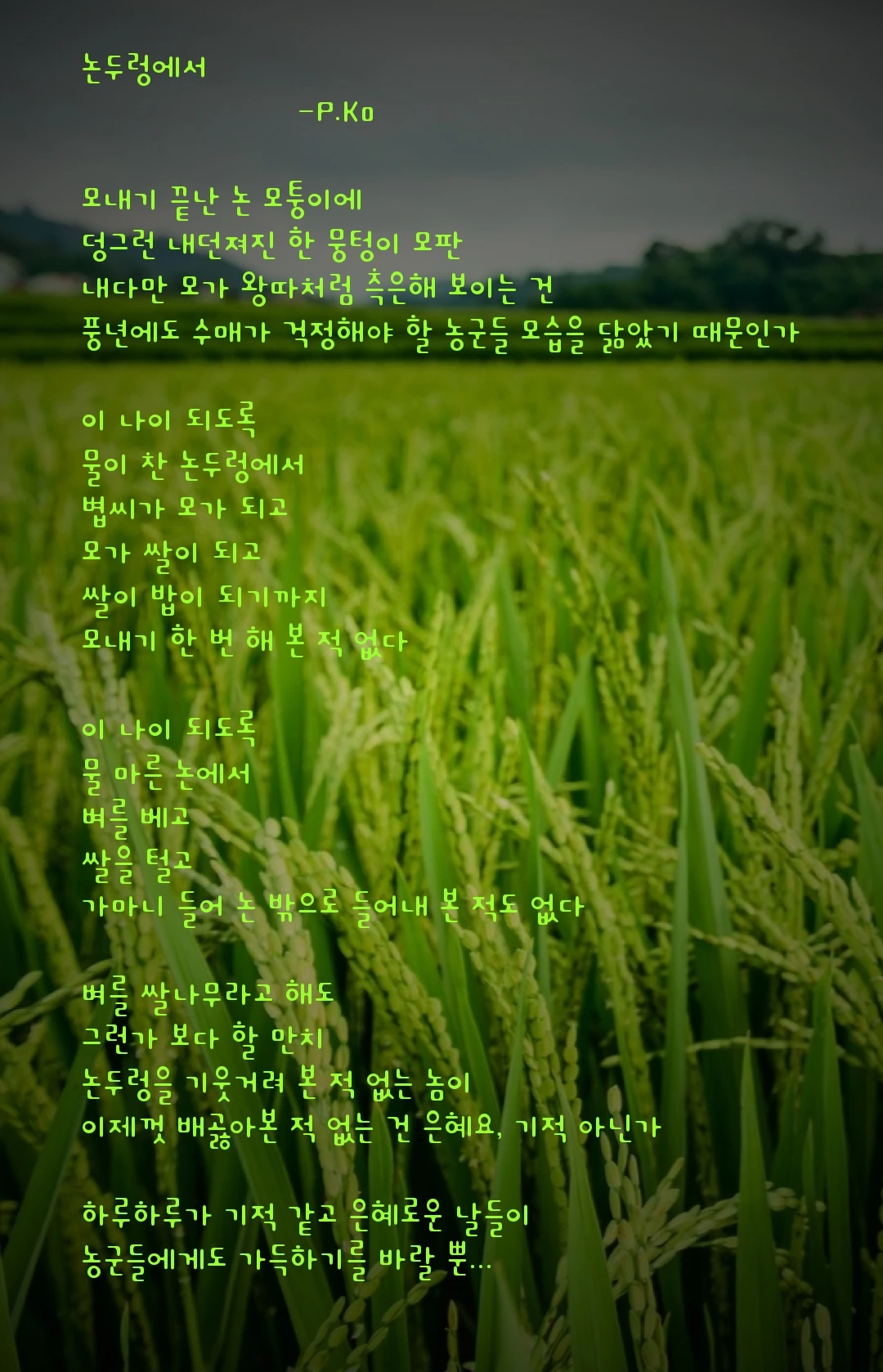 외삼촌은 제주에서 드물게 논농사를 지었다. 쌀이 자라던 그 논은 지금, 갈대밭이 되었고, 일부는 컨테이너가 차지했다. 외삼촌댁에서 모내기를 하고 보름쯤 지나야 방송에서는 모내기 소식이 들리곤 했다. 밭에는 자주 갔지만, 모를 내 본 적 없이 없는 나는 군에서는 모내기를 경험할 수 있을 줄 알았다. 웬걸, 대민 지원 시기에 정기휴가였다는~~ㅋㅋ
