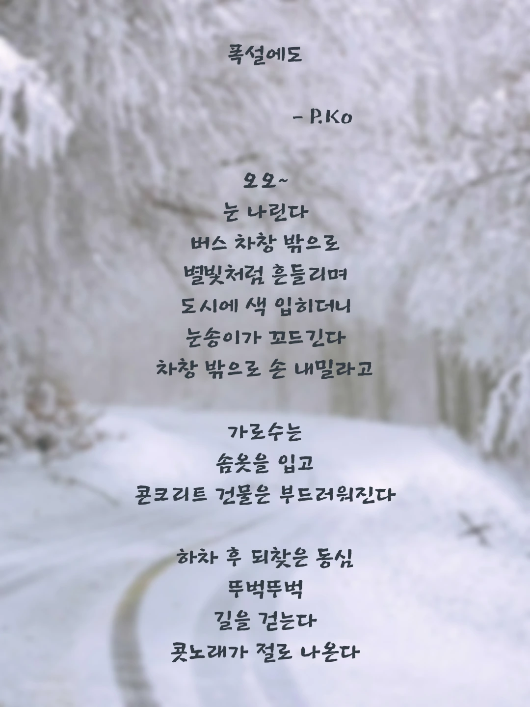 오오~눈 나린다버스 차창 밖으로별빛처럼 흔들리며도시에 색 입히더니눈송이가 꼬드긴다차창 밖으로 손 내밀라고가로수들은솜옷을 입고콘크리트 건물은 부드러워진다하차 후 되찾은 동심