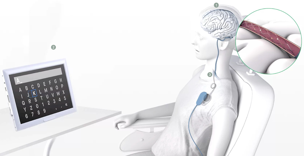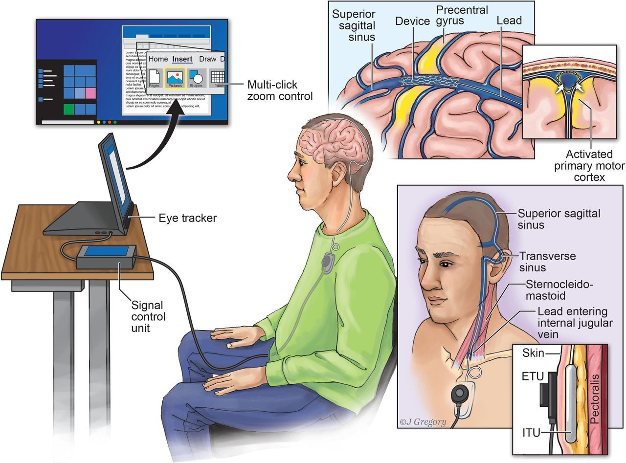 뉴럴링크가 침습적(뇌수술이 필요한) 방식으로 인터페이스를 구축한다면 싱크론은 최소한의 침습적인 방법을 찾았습니다. 싱크론에서 개발한 탐침은 그 모양이 혈관 확장용 스텐트와 유사하게 생겼습니다 (위 사진 참고). 두개골에 직접 구멍을 내는 뇌수술이 필요 없이 목으로 연결이 된 정경맥이라는 혈관으로 탐침을 밀어 넣어 대뇌의 운동피질의 혈관까지 도달하게 하는 것입니다. 그런 후 스텐트를 펴서 뇌의 신호를 혈관 속에서 읽고 보냅니다. 시술이 비교적 간단하게 이루어지며 부작용도 없습니다. 싱크론이 리크루트 한 4명의 중증환자들은 설치 후 자신의 생각만으로 컴퓨터 엡에서 메시지를 보내고 온라인 상거래를 하는 등 계획했던 실험을 문안하게 구현할 수 있었습니다.