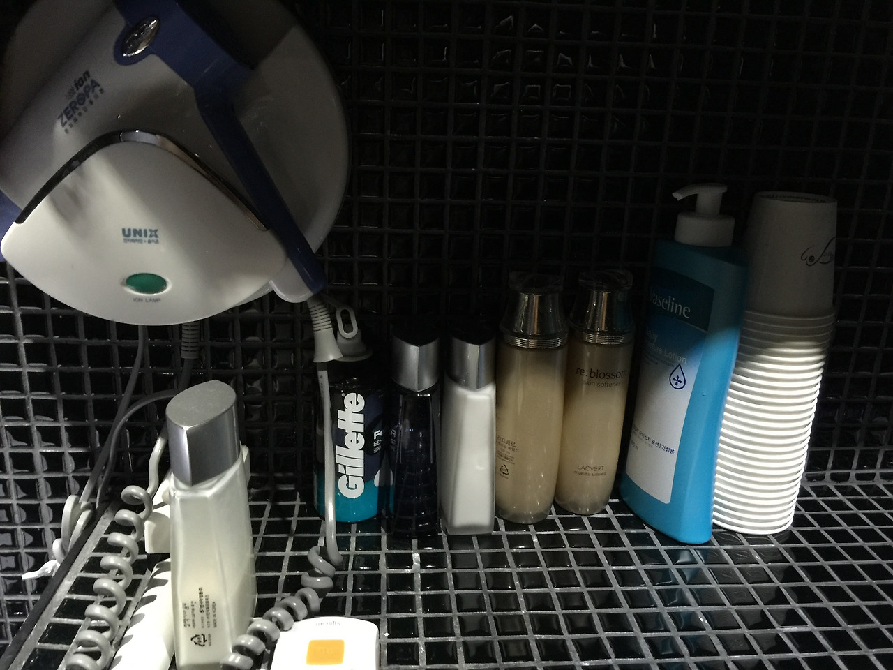 세면대 위에는 드라이기, 로션/스킨, 바셀린까지 여성/남성용 모두 구비가 되어 있었다.