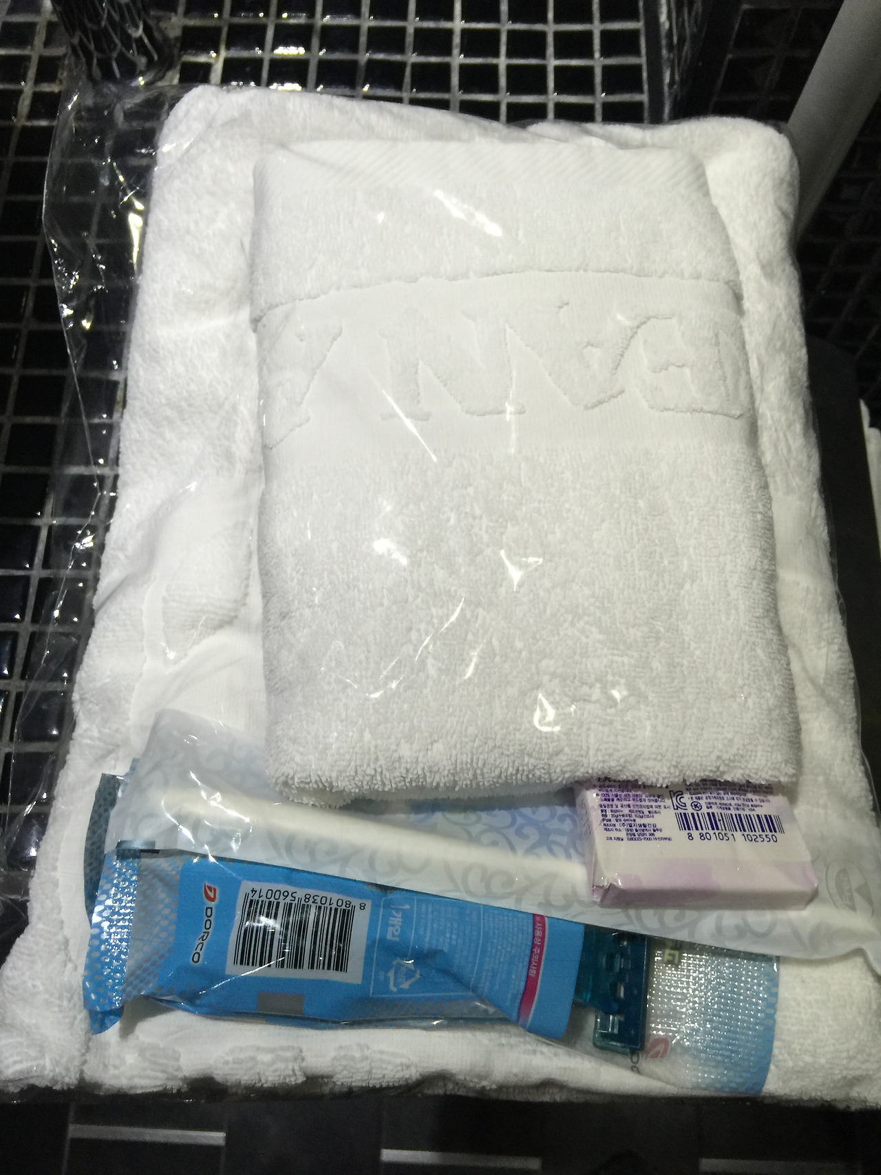 타월 팩에는 면도기, 비누, 치약세트가 깔끔하게 들어있어 상당히 괜찮다.