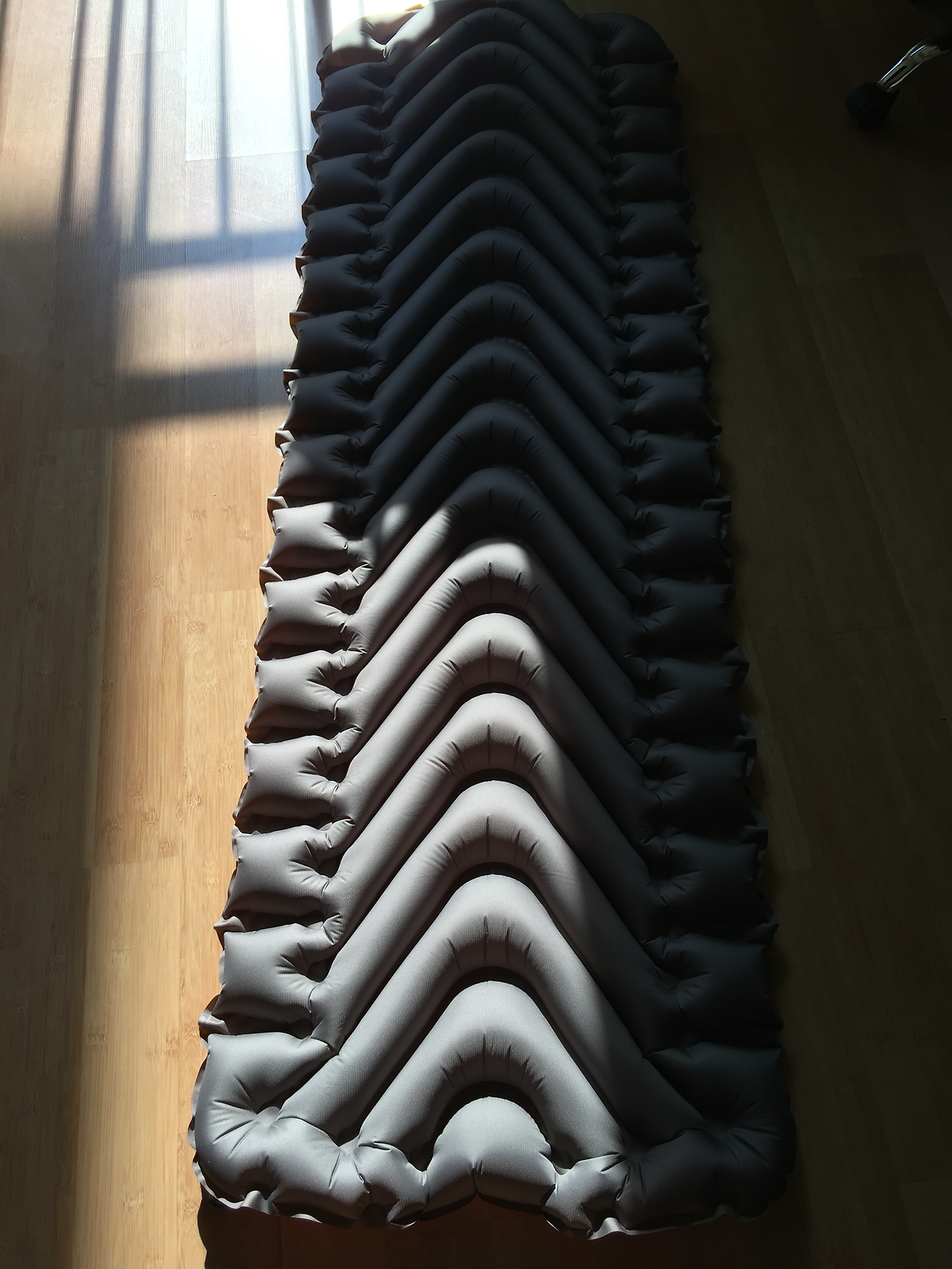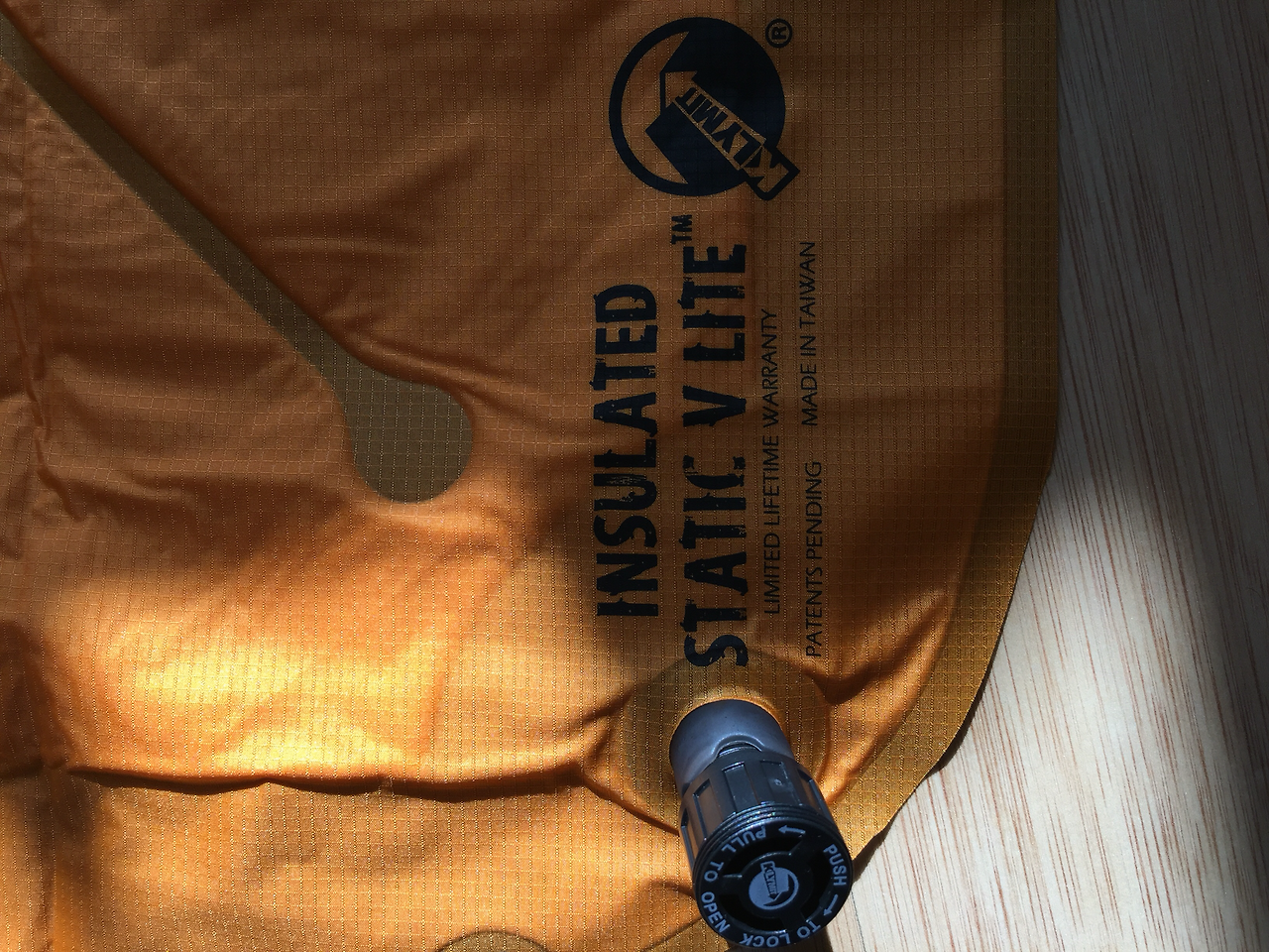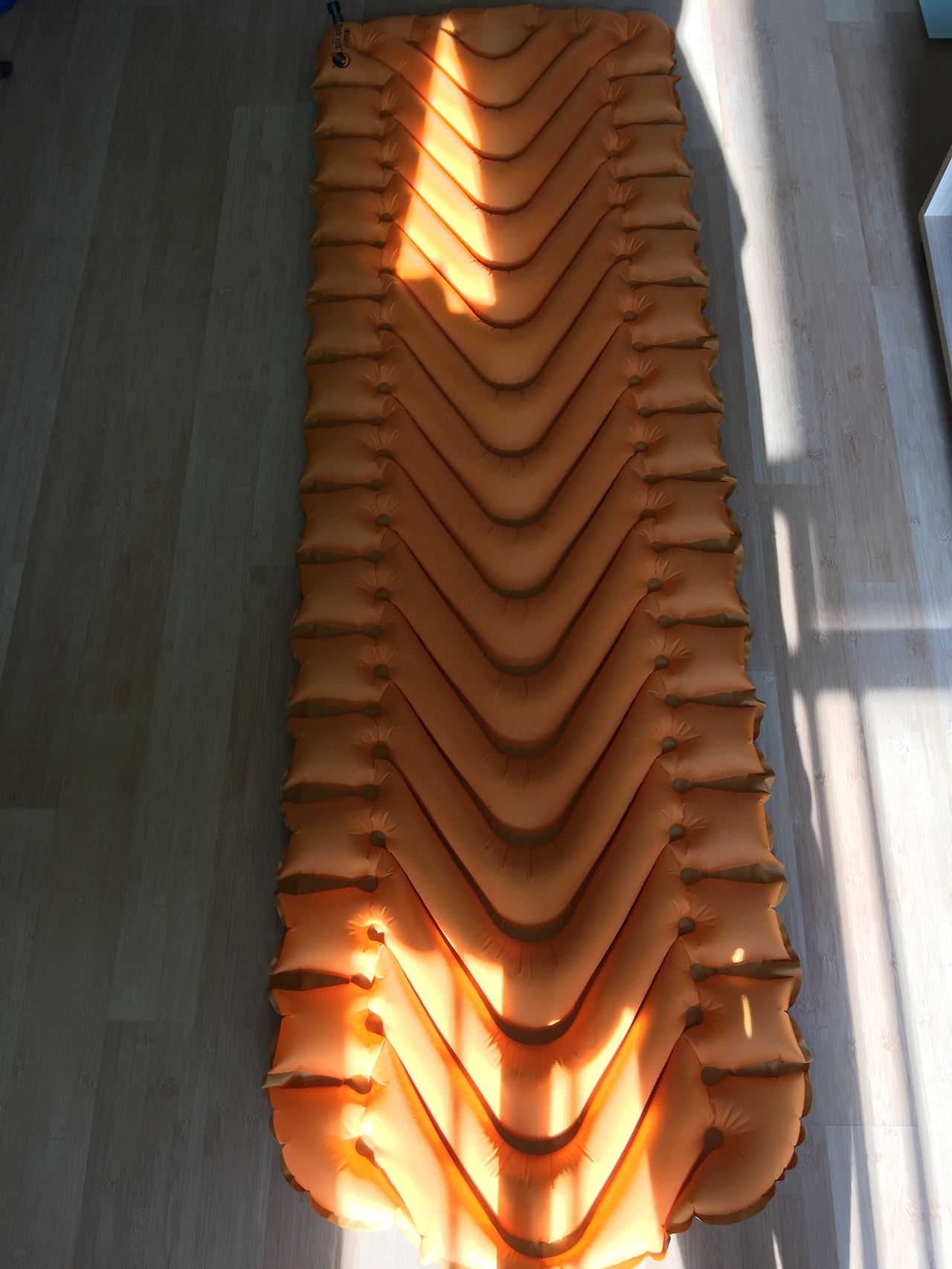 [KLYMIT]INSULATED STATIC V lite (인슐레이티드 스태틱 브이 라이트) 는 보다시피 v자 모양으로 공기가 들어가는 형태로 오히려 한쪽으로 꿀렁이는 현상이 없고 잘 잡아 주는 듯하다. 또한 천이 밀리지 않아서 편안한 잠자리를 만들어 주었다. 높이 또한 6.5cm가 되다보니 등 배김이 하나더 없어 더욱 푹 잘 수 있었다.