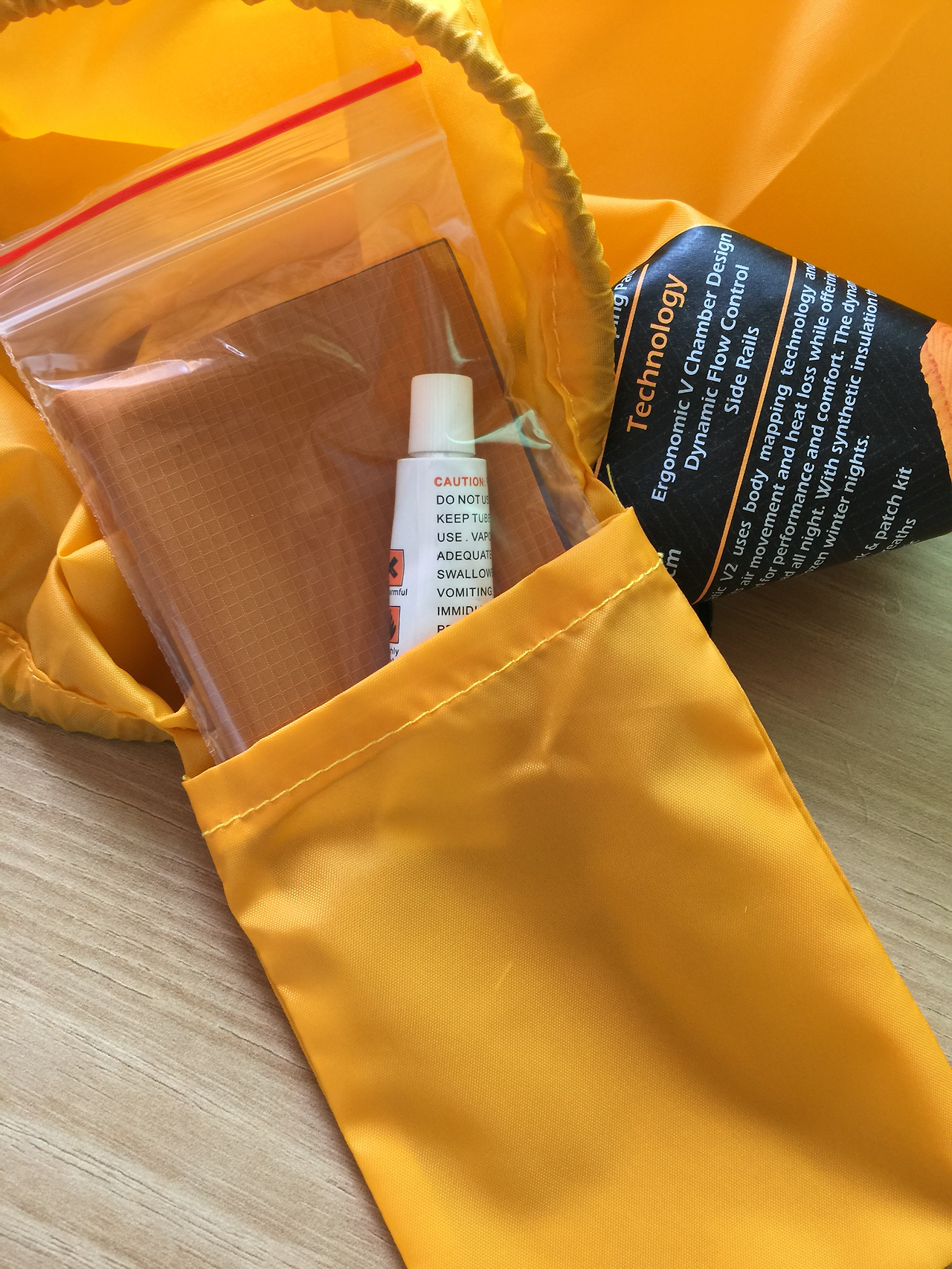 패킹 안쪽에는 주머니가 있는데 열어보니 빵구시 패치할 수 있는 세트가 들어있다. 주머니가 있어 따로 돌아다니지 않아 좋을 듯 하다.