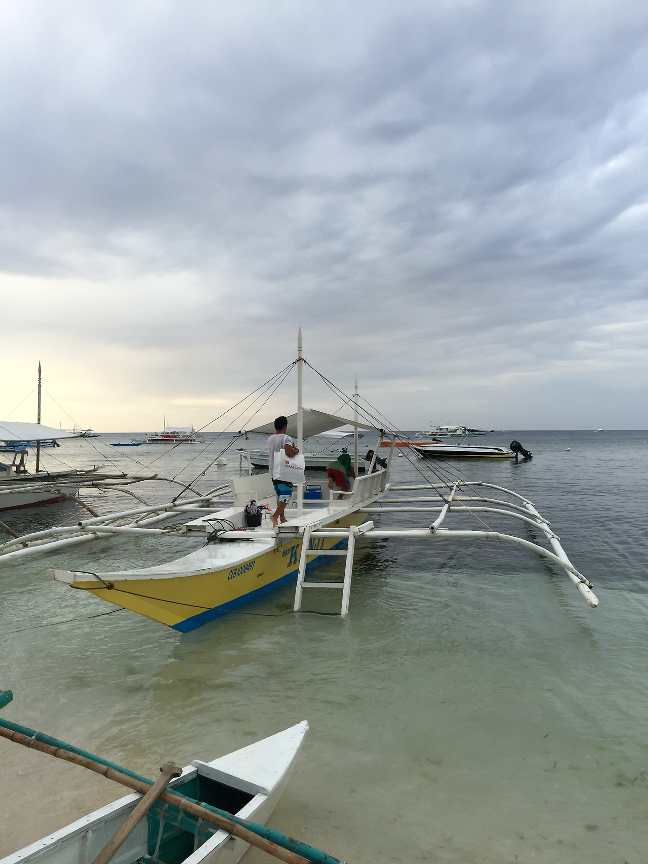 우리가 타고갈 노란색 보트이다. 보트의 양옆에는 중심을 잡아 줄 수 있는 가이드 들이 설치되어 있고 필리핀은 대부분 저런 방식의 보트를 사용한다.