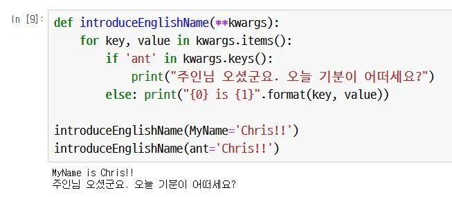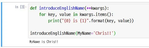 이렇게 kwargs는 사용자가 원하는 방식대로 동작하게 하는 함수를 작성할 수 있습니다.