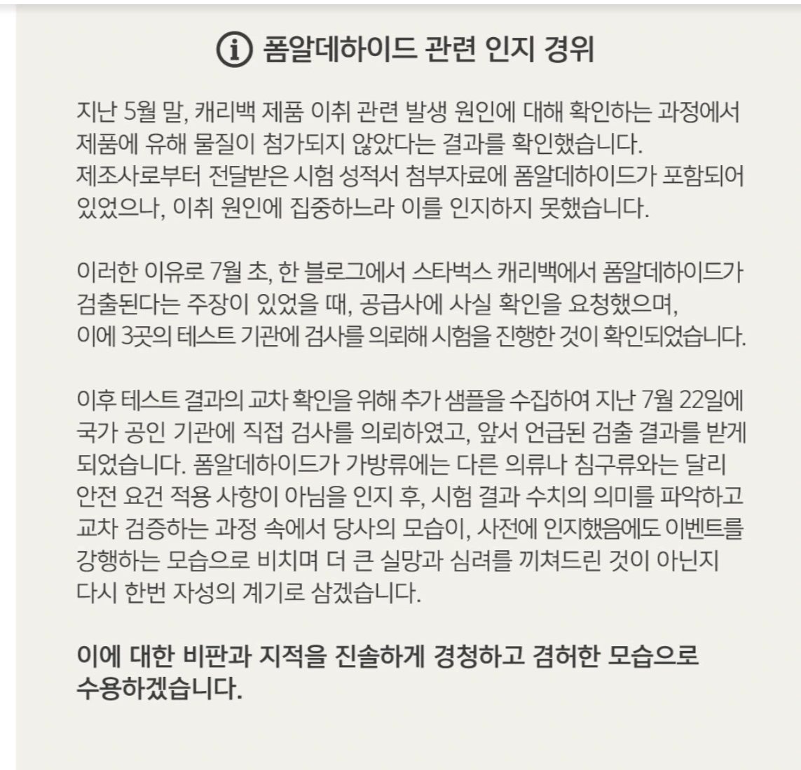 요약을 하자면, 이번에 나눠준 캐리백에서 인체 유해물질인 '폼알데하이드' (과거 포름알데하이드라 불렸던 것)가 검출되었다는 것이다.