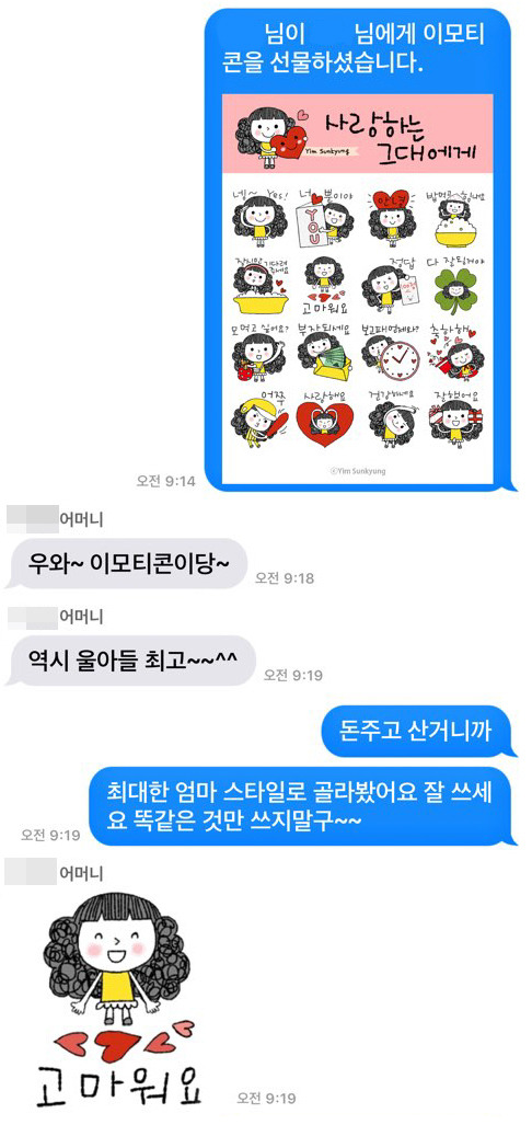 그래서 이번에 최대한 어머니 스타일의 이모티콘을 사서 선물해보자는 생각을 했습니다.