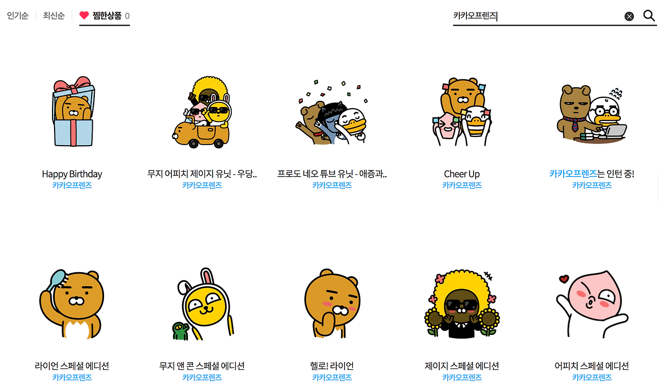 최고 인기 캐릭터 라이언을 앞세운 카카오 프렌즈는 남녀노소 이용하기에 무난한 감정표현과 귀여운 이모티콘이 많습니다.