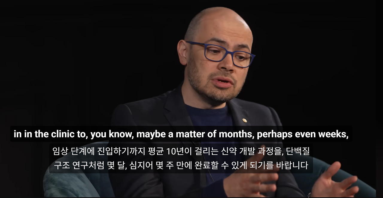 "보통은 생물학 박사 과정을 밟고 있는 똑똑한 학생들이 5년 정도를 연구해야 단백질 구조 하나를 찾을 수 있는데, 우리는 박사 10억 년이 걸려야 얻을 수 있는 결과를 AI를 활용해 불과 1년 만에 얻었습니다."
