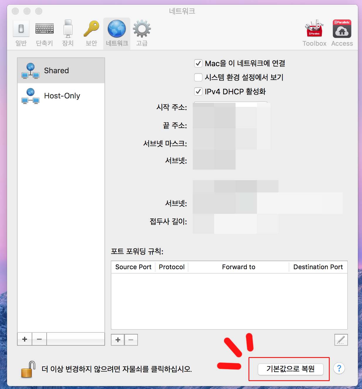 그리고 네이버 블로그, 티스토리 블로그 등을 통해서 수많은 네트워크를 바꿔봐라, 패러렐즈를 다시 다운 받아라, 맥 OS의 공유에서 네트워크를 어떻게 해라 등 수많은 방법을 읽고 시도했다.