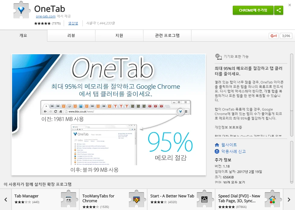 OneTab은 크롬 브라우저들에게는 골머리인 RAM 메모리 절약을 도와주는 확장 프로그램입니다.