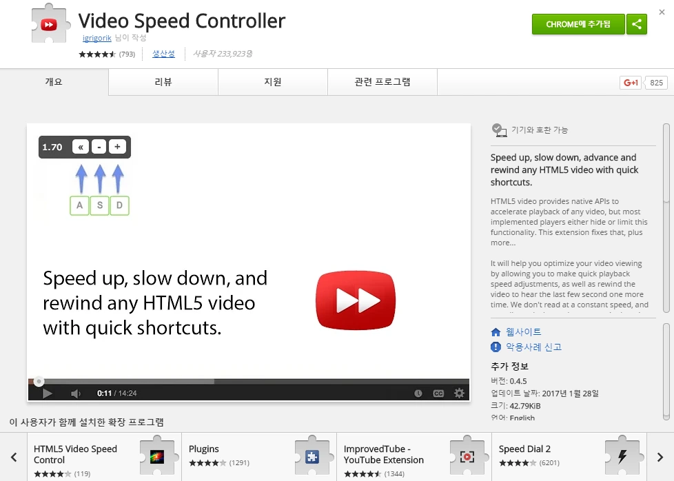 이 확장 프로그램이 알아서 비디오를 빠르게 혹은 천천히 재생하도록 도와줍니다.