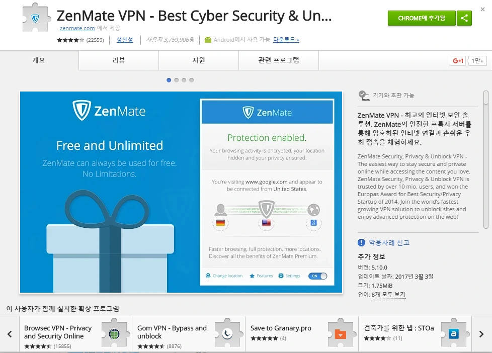 Zenmate는 쉽고 빠르게 안전한 프록시 서버를 통해 인터넷 연결을 할 수 있는 확장 프로그램입니다.