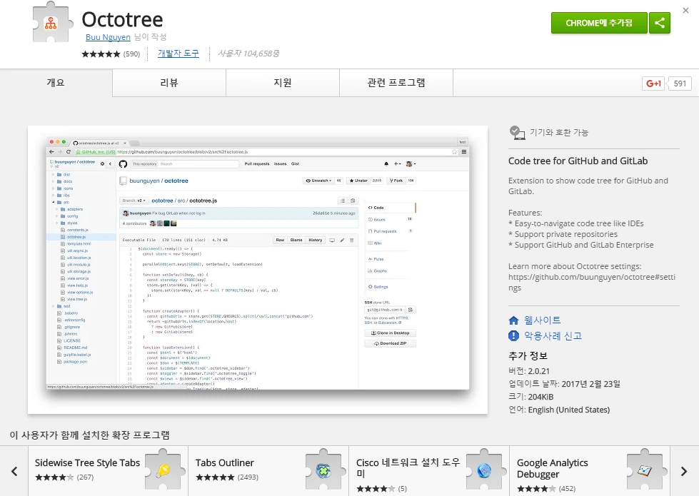 Octotree는 깃허브에 있는 소스들을 일반 에디터처럼 계층화시켜 왼쪽에 보여주는 프로그램입니다.