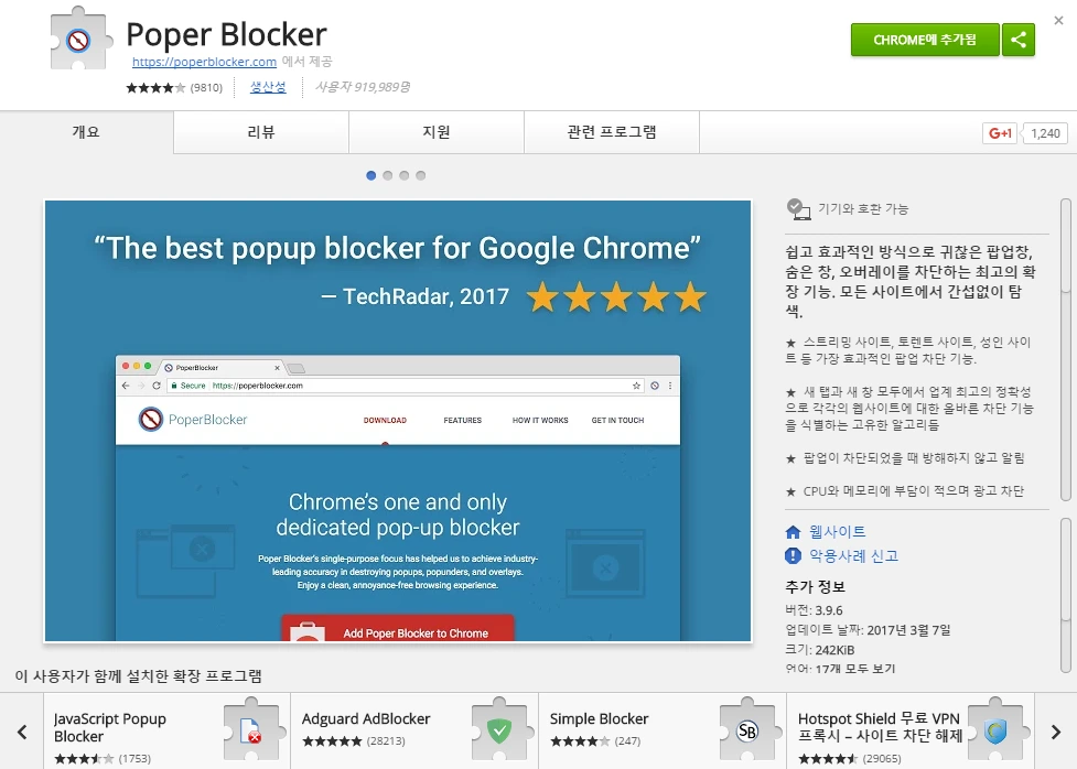 Poper Blocker는 팝업창을 모조리 막아주는 훌륭한 프로그램으로 현재 페이지에서 원치 않다면 클릭 한 번으로 쉽게 기능을 끌 수 있습니다.