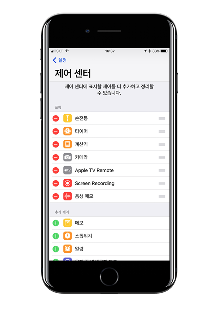 또한, 설정 -> 제어센터를 통해서 제어센터에서 어떤 기능을 추가하고 지울지를 선택하여 사용할 수 있습니다.