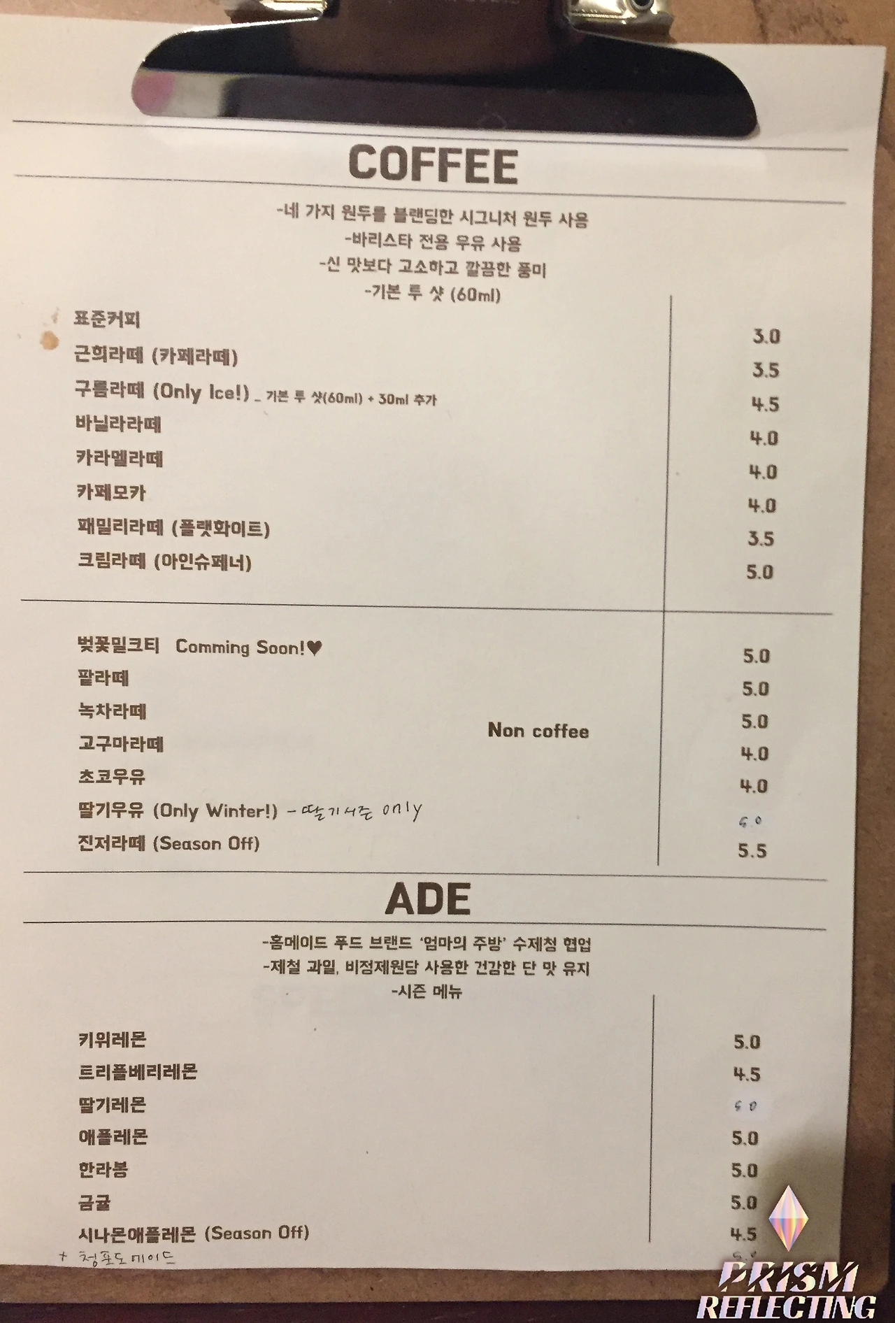 표준커피의 특별한 점은 인테리어 감성뿐만 아니라 '가격'에도 있다. 초창기 때부터 가격을 쭈욱 유지해오고 있는 표준커피의 가격 현재 다른 카페들에 비해서 무척이나 저렴한 편이다. 5, 6천 원부터 시작하는 카페에 비하면 부담 없이 커피를 즐길 수 있는 가격이다.