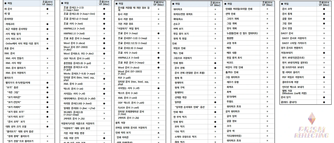 한글과컴퓨터에 전화해서 맥용 소프트는 기능을 많이 못 사용한다고 하던데 어떤 기능을 못 쓰나요? 하면 홈페이지에 정리해두었다고 보라고 한다. 아래 이미지를 보면, 살짝 잘린 상태긴 하지만 마지막 페이지로 갈수록 X표시가 클라이맥스를 찍는 것을 볼 수 있다. 한글 뷰어도 아닌데 이 정도다. 한글로 어쩌다가 작업하는 사람이라면 괜찮겠지만, 아니라면 자신이 지금 어떤 기능이 필요 없는지를 꼼꼼히 체크해보길 바란다.
