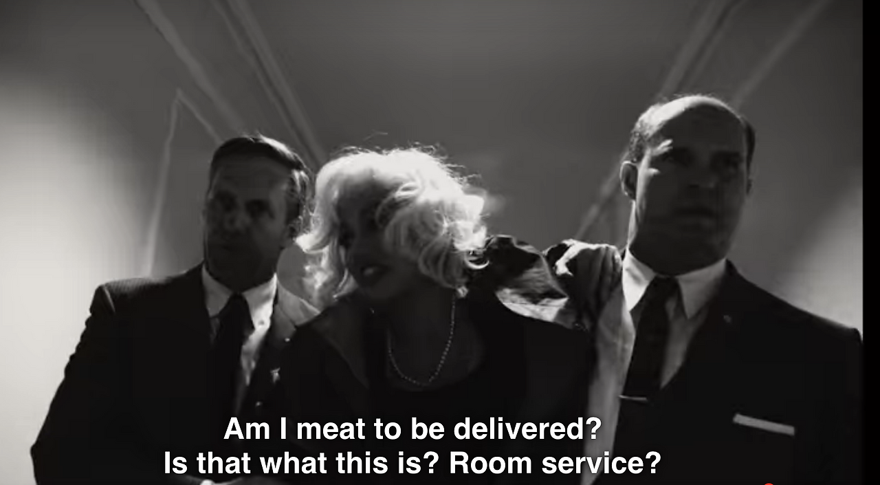 <블론드>는 포르노가 아니다. 부모란 부재로 의지할 곳 없는 곳에서 펼쳐지는 성폭력들에 관한 언급 없이 그녀의 이야기를 이어갈 수 있었을까. <블론드> 속 먼로는 신음하거나 즐기는 섹스 장면을 보이지 않았다. 아무리 정상급의 스타가 되어도 거구의 남자들에게 끌려가며 "Am I meat?(제가 고기인가요?)"라고 말하는 그녀의 대사는 강렬했다. 사랑과 이용을 구분하지 못하는 여성으로서그녀의 덜 자란 결핍의 모습만 보였다. 그리고 결핍을 이용하는 더러운 추악한 사람들의 욕망들.