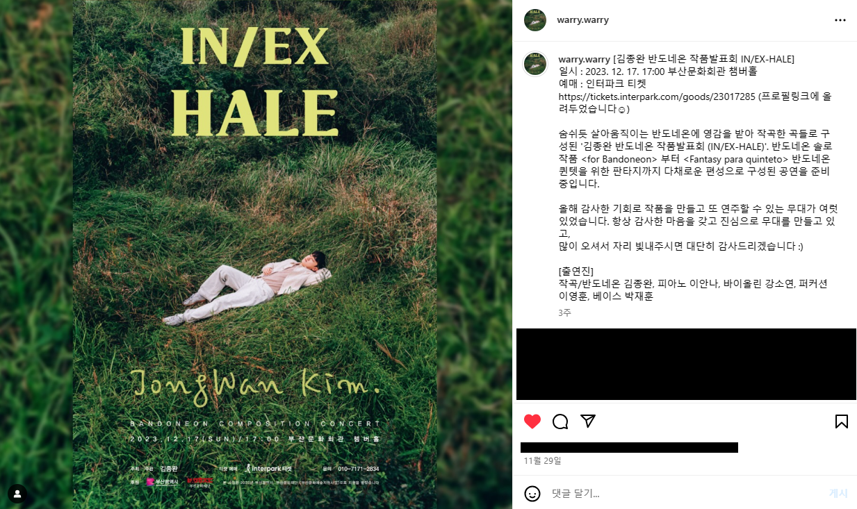 김종완 음악가의 작품발표회 소식 (출처 : 김종완 님 인스타그램)