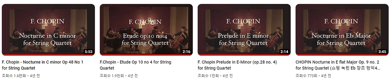 위 네 개의 편곡된 곡 중 <F. Chopin - Nocturne in C minor Op 48 No 1 for String Quartet>, <F.Chopin - Etude Op 10 no 4 for String Quartet>, <F. Chopin Prelude in E-Minor (op.28 no. 4) for String Quartet> 영상들은 '새로운 시도'이라며 몇 시간 반복 재생 영상이 필요하다고 외치는 외국인이 있을 정도로 외국 팬들의 정성 어린 댓글들로 가득하다. 마지막 영상엔 두 개의 댓글이 있는데, '음이 안 맞네요.'라고 쓰인 한국인 댓글이 있다. 이번 쇼팽의 편곡들을 들으며 그 댓글이 떠올랐다. '새로운 시도'보다 '어딘가 잘못됐다'고 잘못된 점을 찾아 굳이 남긴 댓글. 당장이라도 '4년이 지난 지금. 이 사람의 쇼팽 편곡은 엄청난 성장을 이루었습니다.'라고 대댓글을 달고 싶었다.