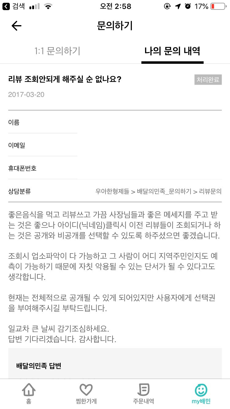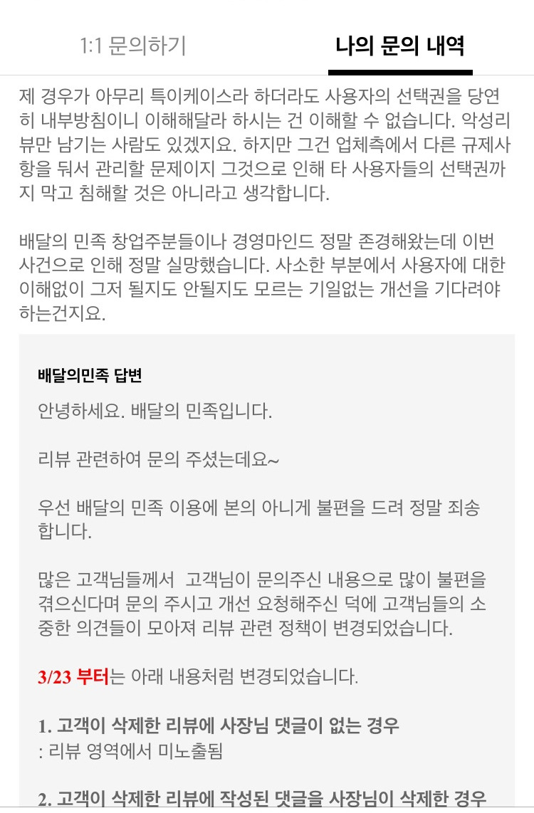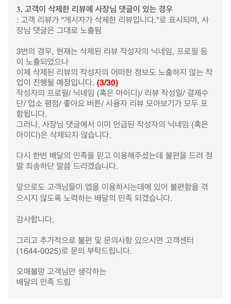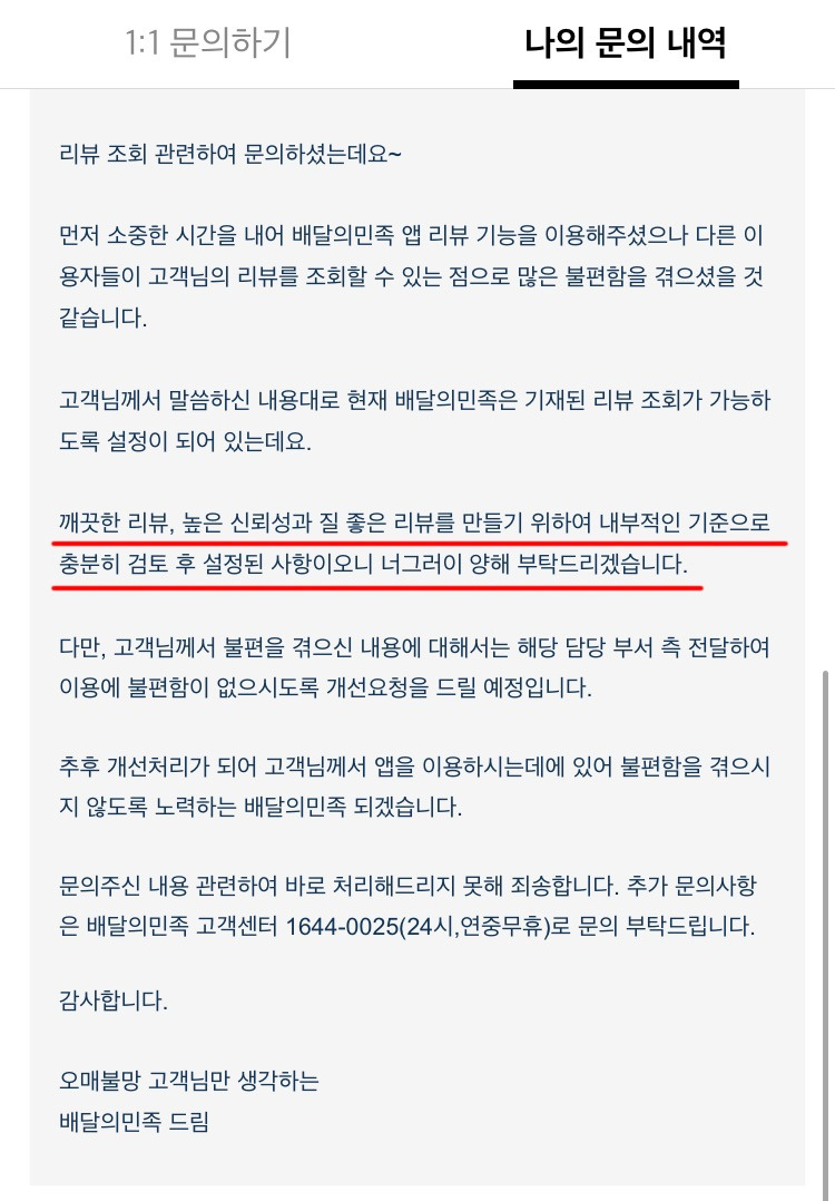 이용자가 리뷰를 공개/비공개 설정할 수 있는 선택권이 없었고, 배달음식의 특성상 해당 이용자의 주문패턴과 지역을 유추할 수 있는 범죄에 노출될 수 있음을 밝혔으나 배달의 민족 측에선 충분히 검토 후 마련된 사항이니 너그럽게 양해를 부탁한다 했다. 전화상으로도 별반 다르지 않았다. 배달의 민족 측에선 그런 의견이 많이 들어오긴 한다고 답변했다. (뭐야 이미 알고 있는 문제였다고?) 게시글과 다르지 않은 흐름이었다. 게다가 안전과 우려하는 기능 악용에 대해서 말하고 있는데, 지금까지 운영해온 기업의 장점이라며 자랑하며 '투명성'을 언급하고 소비자에게 일방적으로 이해하라니.