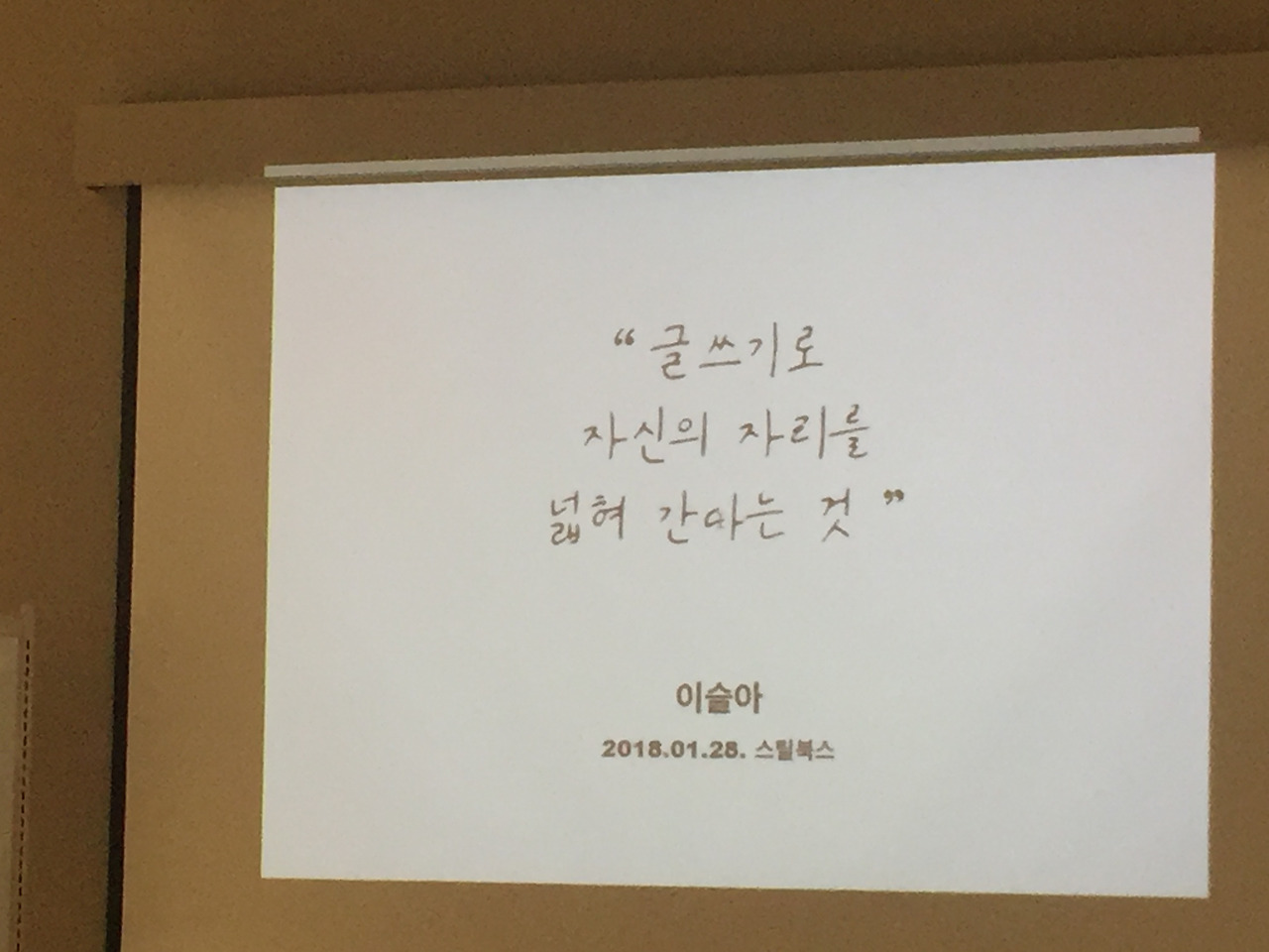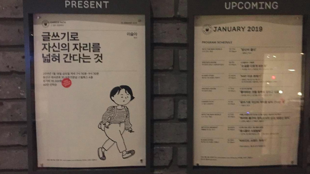 <스틸북스>. 대충 카카오의 어떤 시도, 책이 있는 곳. 그 정도만 알고 갔는데 생각보다 정말 큐레이션이며 공간이며 대기업의 자본이 제대로 훑고 지나가 경이로움마저 들기도 했다. 강연장에 들어서니 이미 몇몇 팬들이 와있었다. 강연 중간에 화장실을 가는 건 맵시가 없기 때문에 화장실을 다녀오는데 이슬아 작가님이 보였다. 모르는 척했다. 강연 시작 전에 박태환처럼, 프로들은 준비 시간에 무척 긴장되고 나름의 집중이 필요한 트레이닝을 할 수도 있으니까. 방해하고 싶지 않았다. 자리로 돌아오며 이번엔 사랑의 깜빡이를 켰다고 생각하고 자신 있게 엉덩이를 의자에 붙였다. 주섬주섬 노트와 속기사용 연필 샤프를 꺼냈다. 곧 스크린에선 어떤 외국 여자 가수가 노래를 부르는 유튜브 영상이 띄워졌고, 스피커에선 코가 얼큰한 추위를 덮는 포근한 노래가 들렸다.