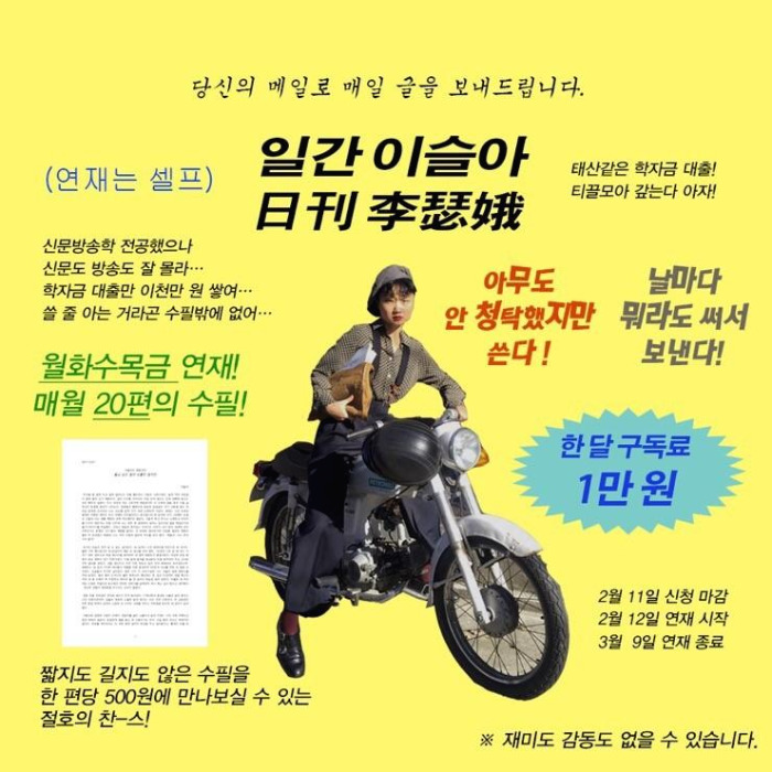굉장히 레트로 하면서도 당찬 포부가 느껴지는 포스터 이미지. 하지만 덜컥 구독할 수가 없었다. 확신이 없었다. 기다릴 자신은 더 없었다. 낯선 방식이었기 때문에 생소하기도 했다. 큰 부담이 느껴질 만한 일도, 그런 가격도 아닌데, 거의 매일 책을 샀으면서도 쉬운 일이 아니었다. 이전에 후회했었기 때문에 충동질은 더 심했다. 후회할까 말까. 그도 그런 것이 문장만 마음에 들어서 산 책 백몇십 페이지에서 성적 수치심이 느껴질 만한 글을 보고 불쏘시개로 만든 이후여서 더 그랬다. 그렇게 여름이 지나가고, 가을이 왔다. 나만 알고 있는 나와 (일간) 이슬아와의 인연은 그렇게 끝나는 것 같았다. 그러던 10월, 그녀가 언리미티드 에디션에 참가한다는 소식을 봤다. <일간 이슬아> 단행본과 함께.