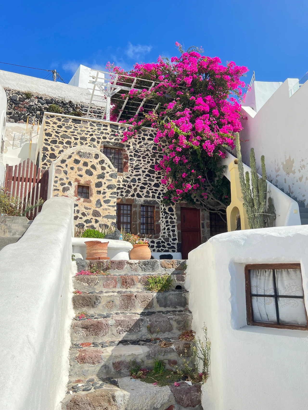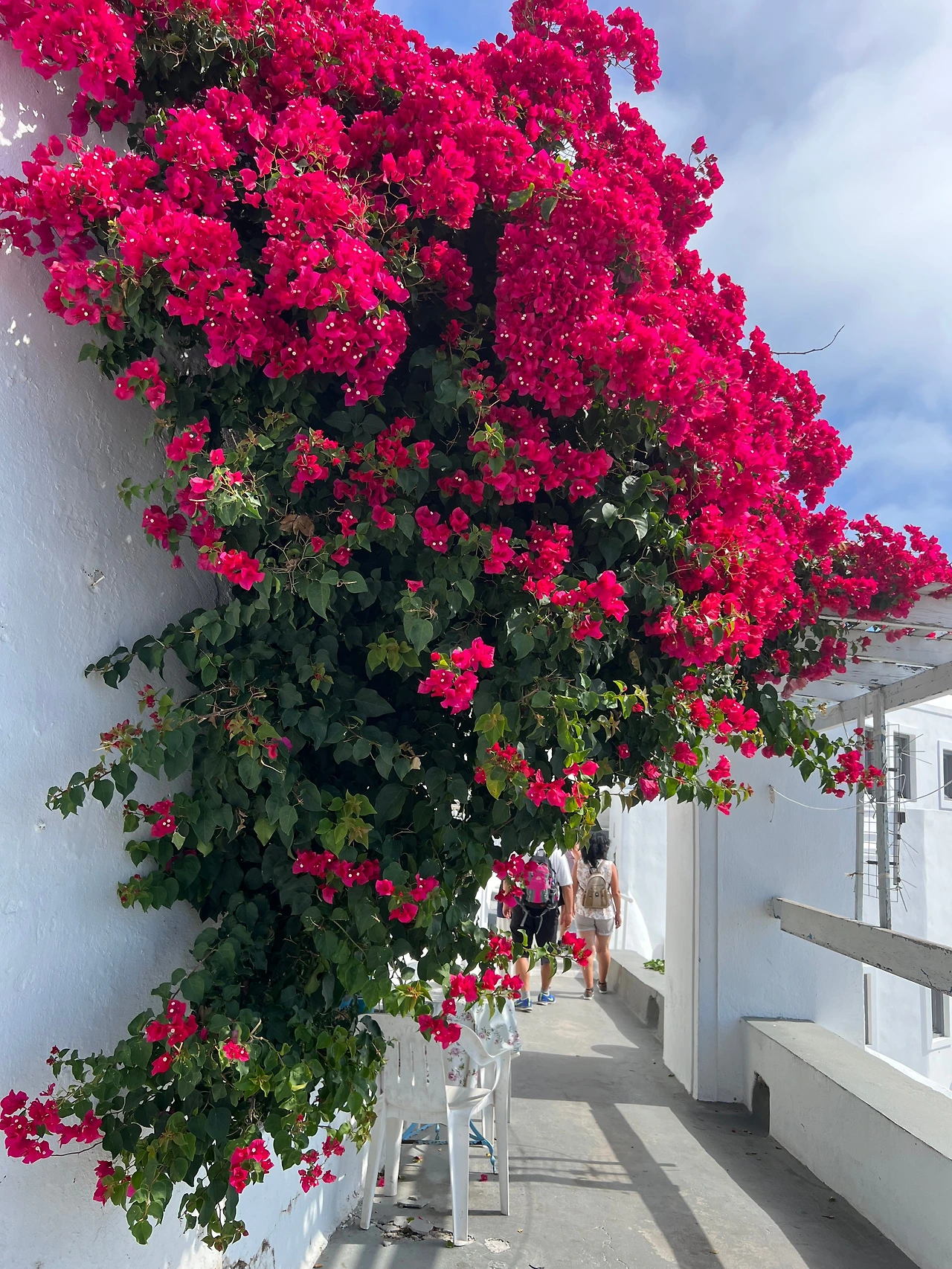 피라에 도착한 첫날부터 우리를 반긴 것이 있다. 골목마다 길가의 담장 너머로 멋들어지게 핀 붉은 핑크, 부겐베리아 꽃이다. 예쁘기도 하면서 뜨거운 태양이 내리쬐는 하얀 피라 섬과 잘 어울리는 꽃이다. 여인들이라면 그냥 지나치지 않는다. 멋들어지게 늘어진 꽃 아래서 카메라를 들이대기 일쑤다. 대번에 부겐베리아에 빠져든다!.