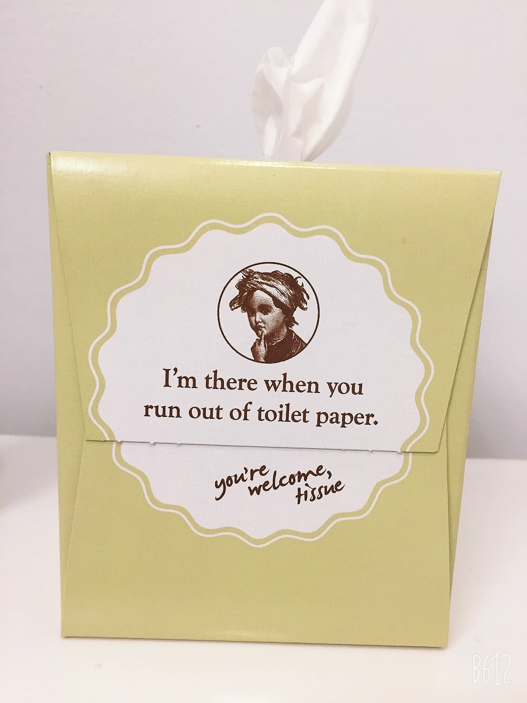 I'm there when you run out of toilet paper./ you're welcome, tissue/ 화장지가 떨어지면 금방 갖다 드리죠. / 나의 기쁨이에요, 티슈로부터.
