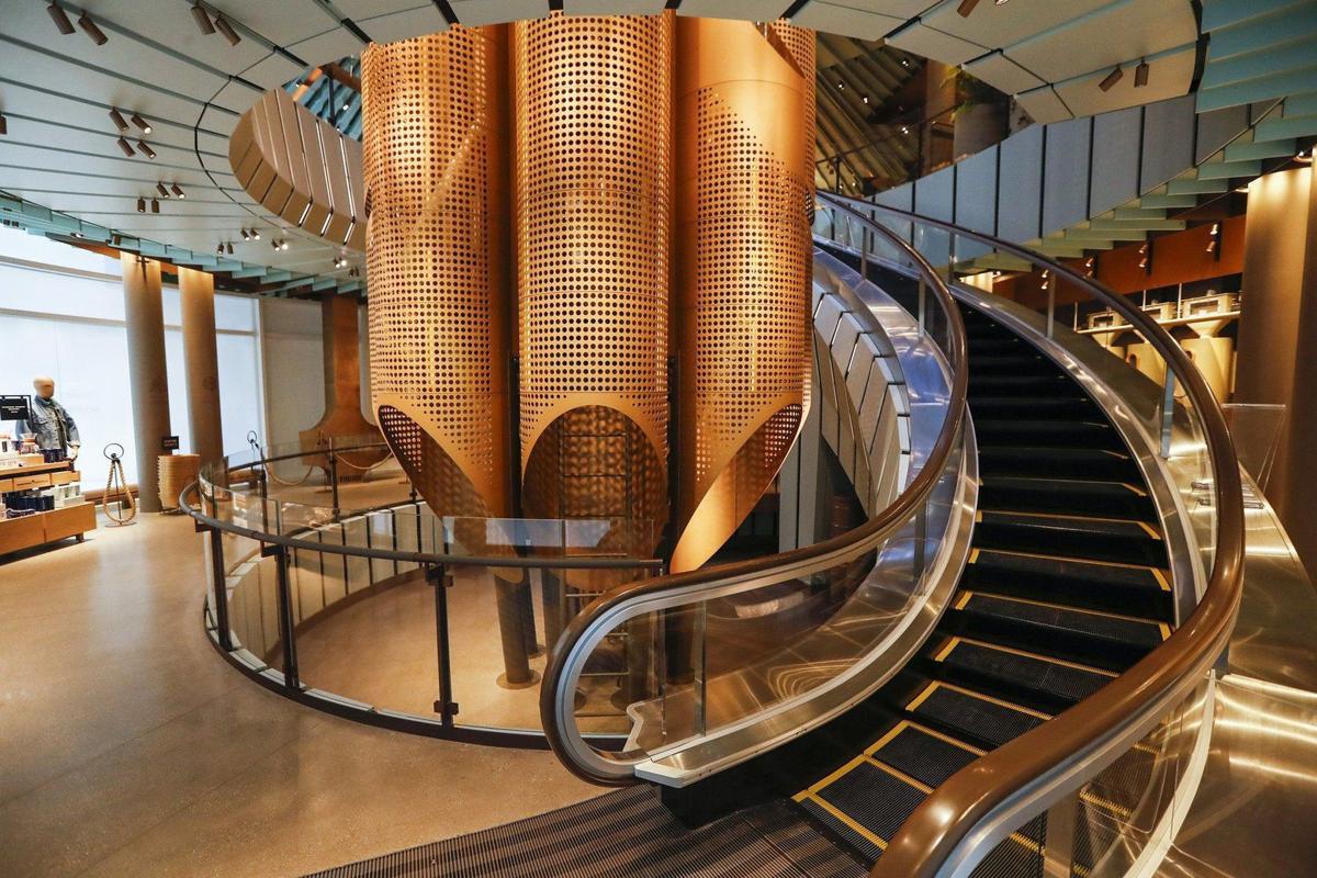 1층에서 또 다른 볼거리는 5층까지 화려하게 뻗어있는 타워다. 황금색의 타워는 커브로 된 에스컬레이터 중앙으로 금탑처럼 들어서 있다. 여덟 개의 금빛이 나는 청동색 튜브로 만들어졌다. 캐스크(cask:통)라고 한다.