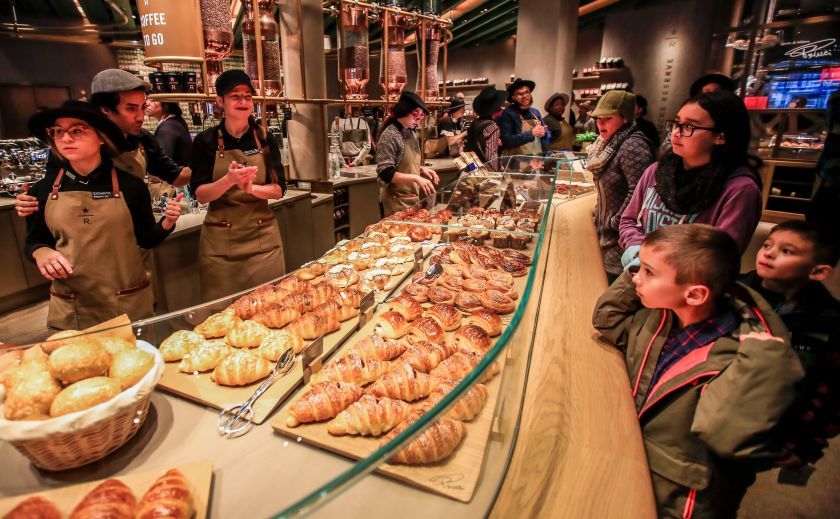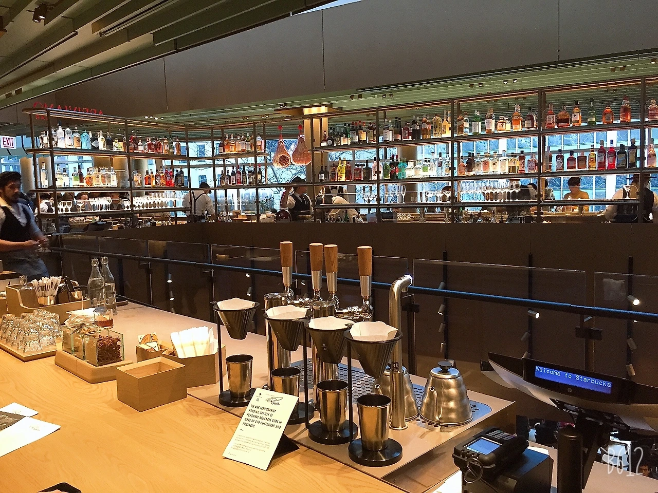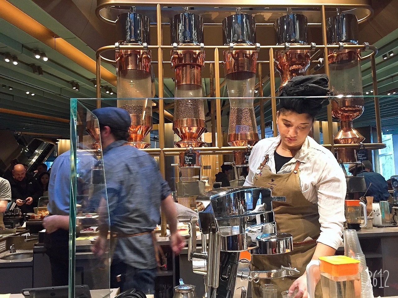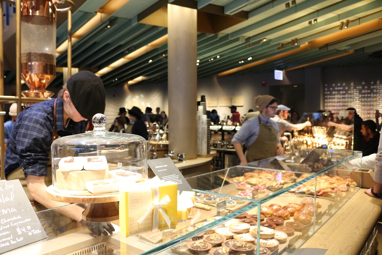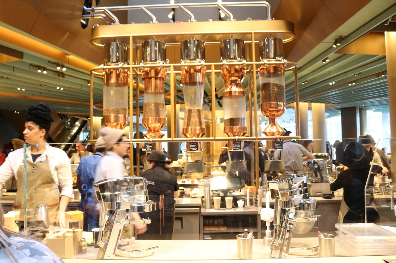 스타벅스 리저브 로스트리가 오픈한 후로 나는 처음 방문이고 레베카는 두 번째다. 그녀가 안내하는 데로 가면 된다. 벌써 저만치서 수많은 사람들이 들어가고 나오는 빌딩 입구가 눈에 띄었다. 드디어 스타벅스다! 밖에서 줄을 서서 기다리는 일 없이 바로 들어갈 수 있었다.