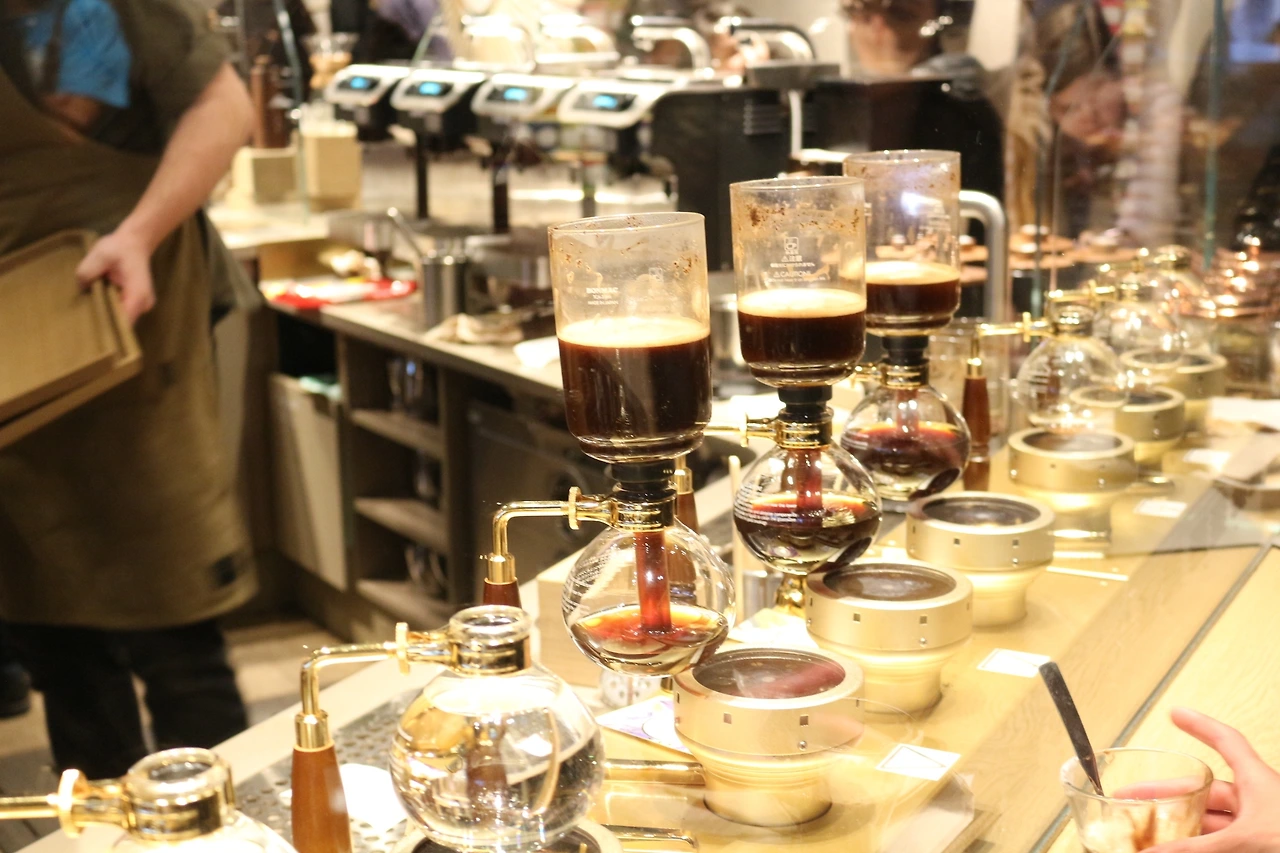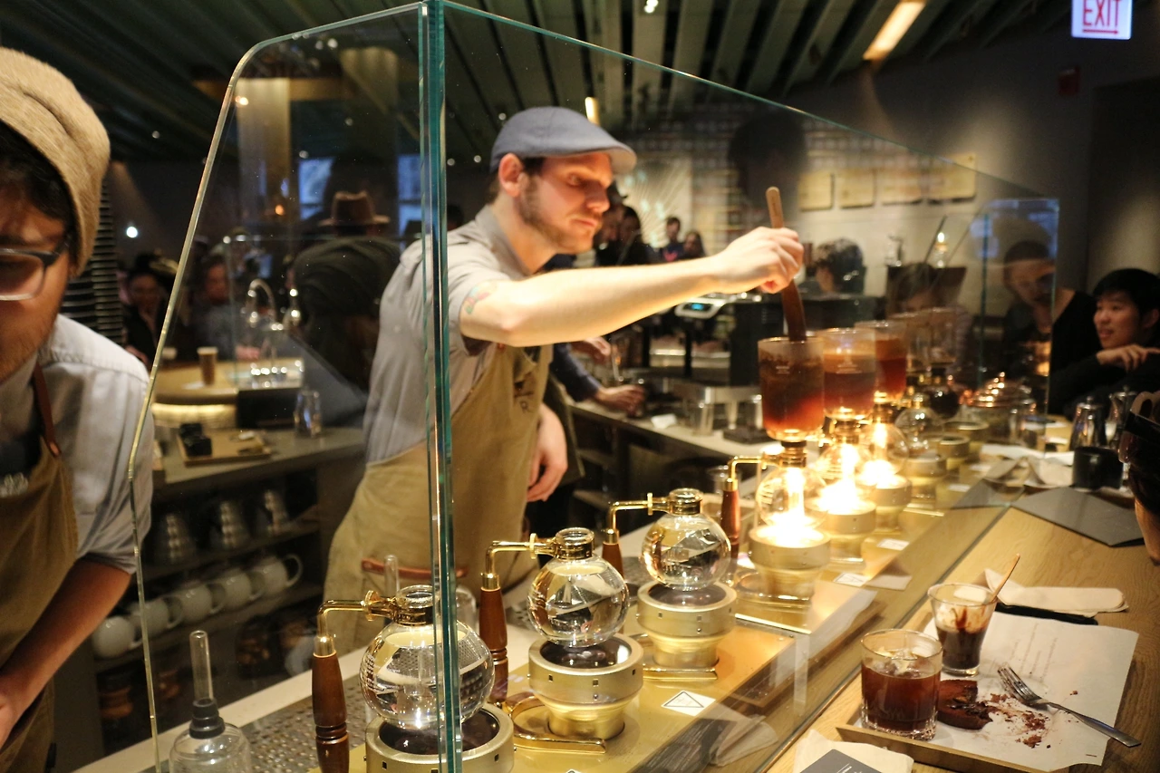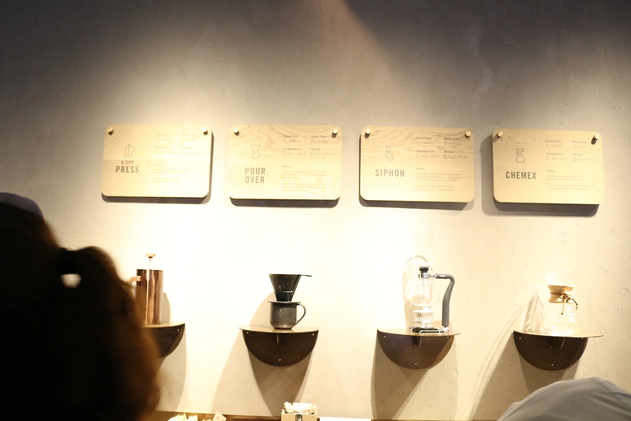 바 중앙으로 쭉 펼쳐져 있는 카운터에 앉아 특별한 드링크를 만드는 직원들을 구경하는 사람들, 바리스타와 대화를 나누면서 커피 브루잉(brewing) 과정을 지켜보고 배울 수 있는 특별한 기회를 가질 수 있다. 간단히 커피도 맛볼 수 있다!