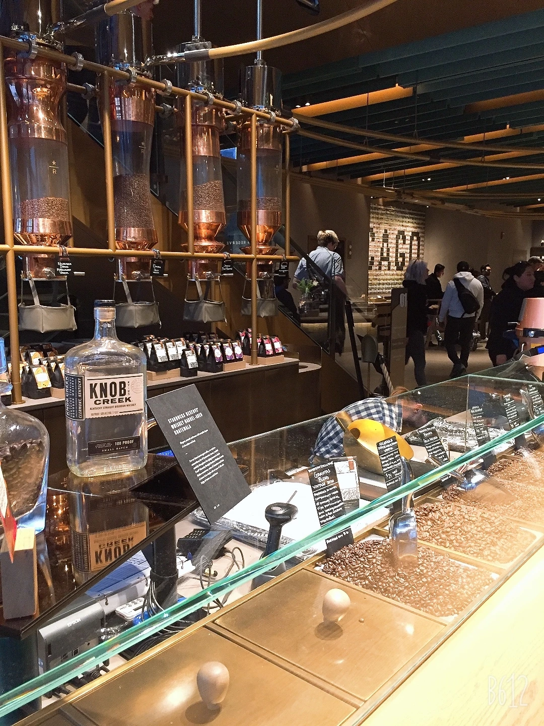 디자이너”질 이노모토(Jill Enomoto)”는 커피의 향이 1층에서 시작하여 5층까지 흐른다는 의미로 “커피 모래시계”(coffee hour glass)라고 표현한다. 거대한 캐스크(통)는 에스컬레이터가 주위를 회전하는 것처럼 파이프를 통해 로스팅하는 커피빈을 전 층에 전달하는 역할을 한다. 이런 광경을 그 자리에서 볼 수 있다.