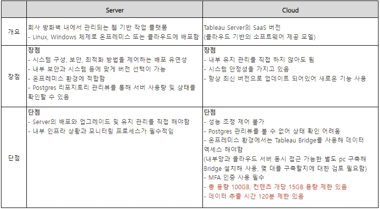 Tableau Cloud : 서버를 지속적으로 관리할 인력이 부재하고, 상대적으로 적은 용량의 데이터를 운영하는 경우