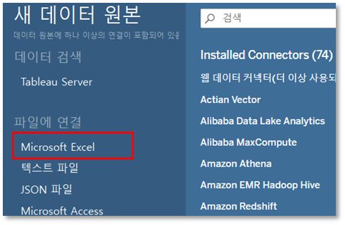 ‘슈퍼스토어-샘플’ 파일은 엑셀이므로 Tableau에서 소스 유형을 ‘Microsoft Excel’로 선택해 주시고 파일을 불러옵니다.