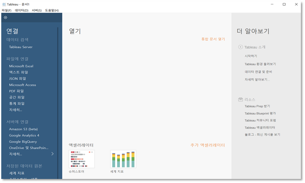 Tableau Desktop을 설치한 후 실행하면 아래와 같은 첫 화면을 보실 수 있습니다. 좌측 파란색 영역에서는 Tableau에 연결할 수 있는 소스 데이터 유형이 리스트업 되어 있고, 우측 진한 회색 영역에는 Tableau 무료 교육 동영상 등에 대한 링크가 걸려 있습니다. 교육 동영상이 잘 정리되어 있어 Tableau를 처음 사용하시는 분들은 해당 링크를 적극 활용해 보시는 것을 추천드립니다.