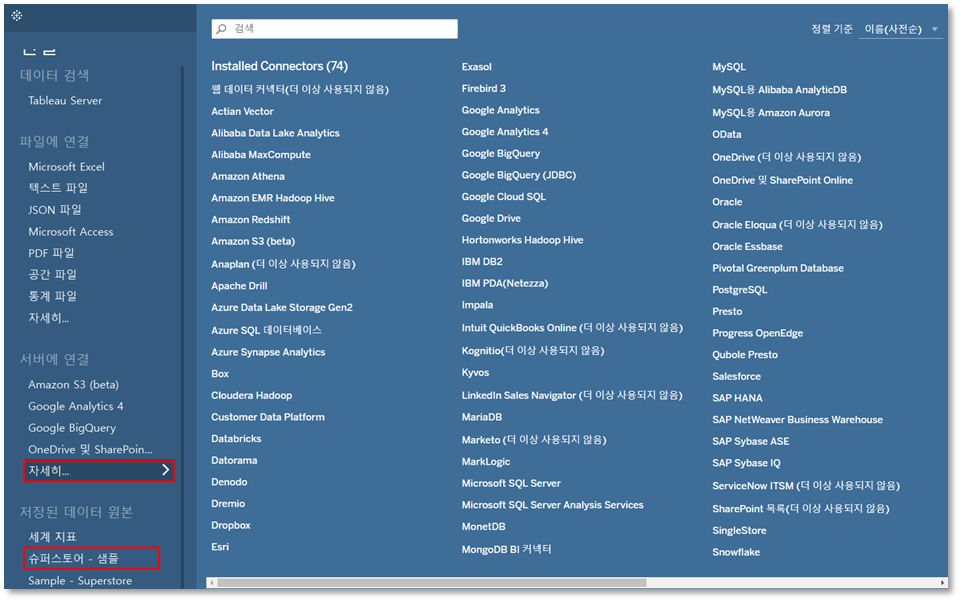 파란색 영역에서 연결할 소스 데이터의 유형을 선택합니다. 원하는 데이터 소스가 없을 경우 ‘자세히’ 버튼을 클릭하시면 Tableau에 연결할 수 있는 모든 소스들이 나오니 여기에서 선택하시면 됩니다.