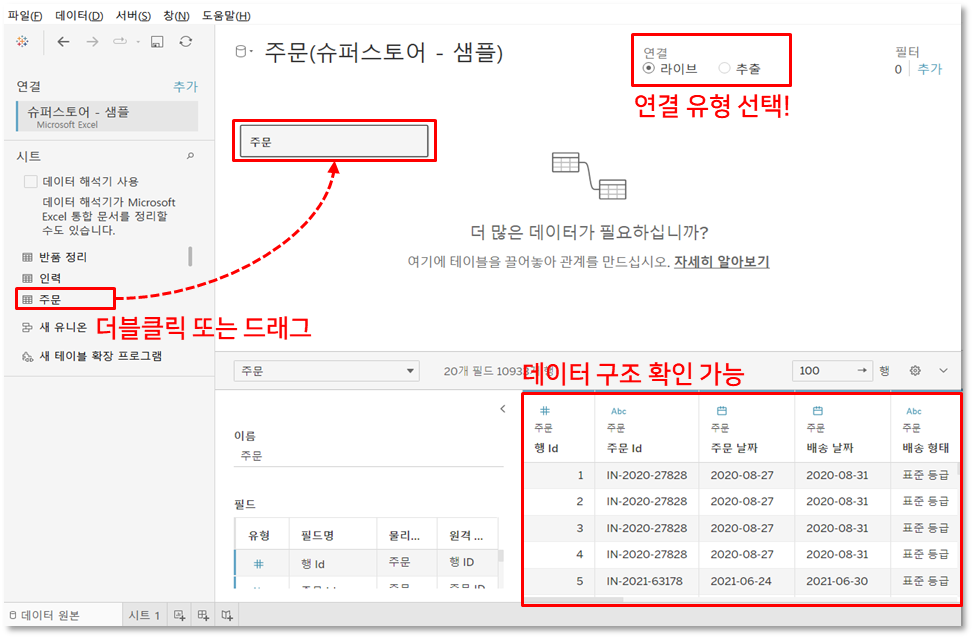 ‘라이브’는 말 그대로 데이터를 실시간으로 연결한다는 의미입니다. 연결된 데이터 원본에 업데이트 사항이 있으면 Tableau에서도 업데이트된 데이터가 보입니다. 다만 실시간으로 연동되어 있어 데이터를 계속 불러와야 하므로 분석하거나 대시보드를 그릴 때 속도가 느려질 수 있는 단점이 있습니다.