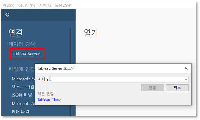 만일 사내에 이미 Tableau Server를 사용하고 계셔서 해당 Server에 공유되어 있는 데이터 원본에 연결하고 싶으시다면, 최상단의 ‘Tableau Server’를 클릭하셔서 서버 주소와 아이디로 로그인하시면 됩니다.
