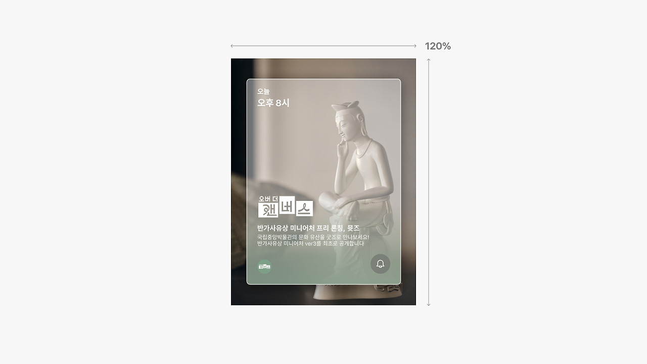자이로 센서가 적용되는 이미지는 UI 프레임보다 커야 합니다. 의도한 움직임 반경에 맞춰 레터박스에 잘려 보이지 않도록 이미지 크기를 정합니다. 큰 움직임을 의도할수록 더 큰 이미지가 필요합니다. 저희는 최대 20%까지 움직임을 의도해 어드민에 등록된 이미지를 클라이언트에서 120%로 불러옵니다.