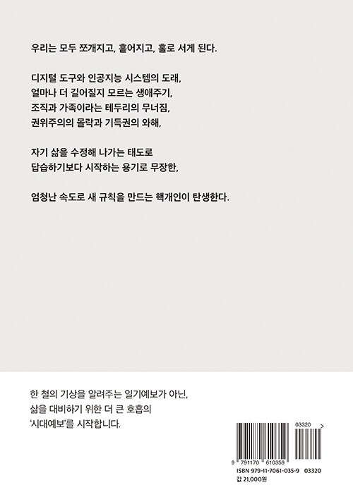 무엇보다도 이 책은 제목처럼 다가올 시대를 예보한다. 마치 “내일은 비가 오니 우산을 챙기라”라고 알려주는 기상예보처럼, 앞으로의 시대에 나는 어떤 준비와 태도를 가져야 하는지를 생각하게 만든다.