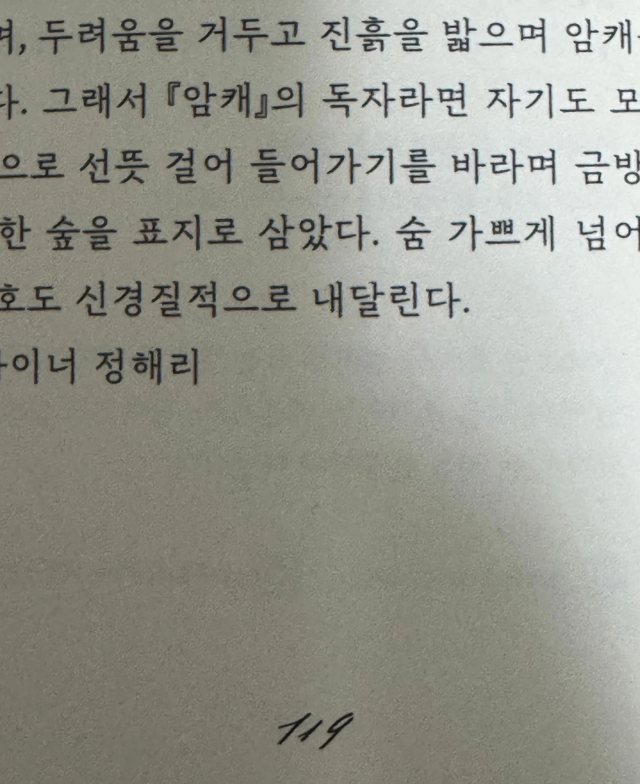 책을 완성하기 위해 수많은 이들의 고민이 있음을 엿볼 수 있다. 아래 두 개의 인용문은 각각 번역가 최이슬기 님과 디자이너 정해리 님의 글을 가져왔다. 한국어로 옮기면서 제목이 암캐가 된 것, 쪽 번호의 폰트조차 그냥 결정된 것은 하나도 없음을. 한 권의 책이 독자 앞에 놓이기까지 얼마나 많은 숙고가 축적되는지 새삼 느낄 수 있었다.