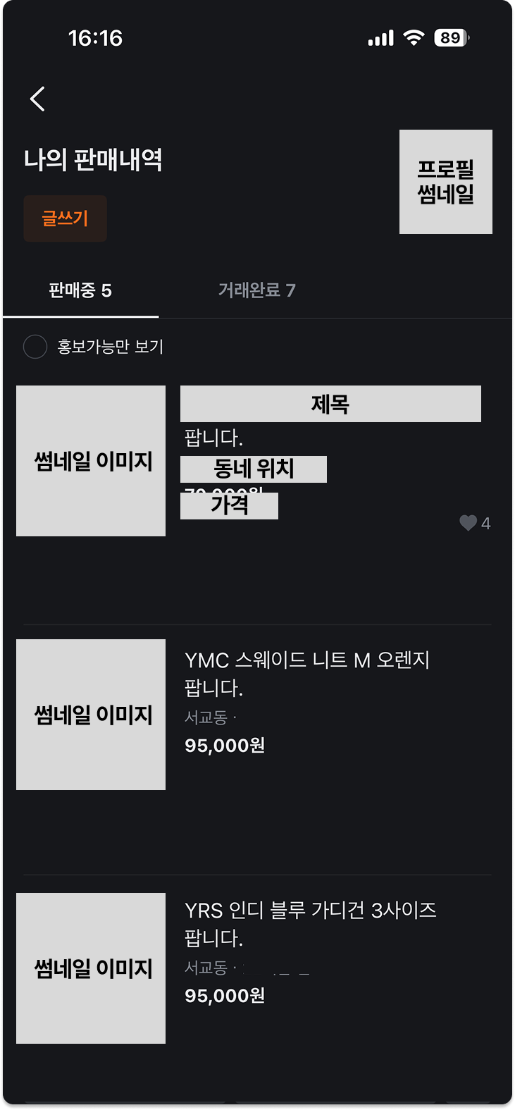 Create (생성): ‘내 물건 팔기’ 기능은 보이지만, 작성 완료 후 어떤 화면으로 이동하는지, 성공/실패 시 액션은 어떻게 되는지 정의되어야 합니다.