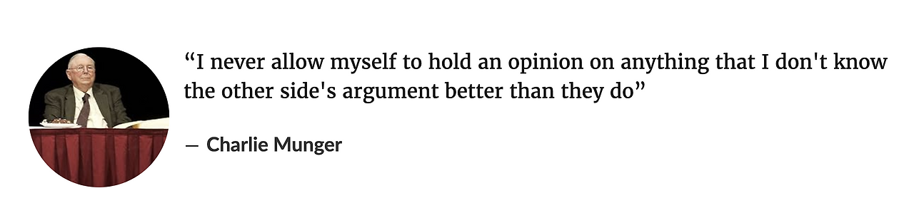 내가 왜 옳은지 이유를 많이 모은다고 내 결정이 정확해지지 않습니다. 오히려, 내가 틀릴 가능성을 깊게 탐구해서 언제 전략을 버려야 하는지 알아야 내가 나쁜 결정을 내릴 가능성이 줄어듭니다. 찰리 멍거도 본인 의견에 반대하는 사람만큼 반대의견을 잘 알고 있어야지만 의견을 가질 수 있다고 한 적이 있지요.