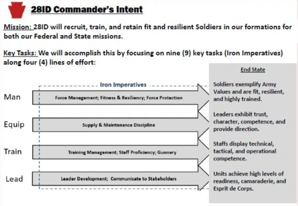 미군 작전계획에는 “지휘관의 의도”라는 짧은 문장이 있습니다. 지휘관의 의도는 짧게 표현한 지휘관의 목표입니다.