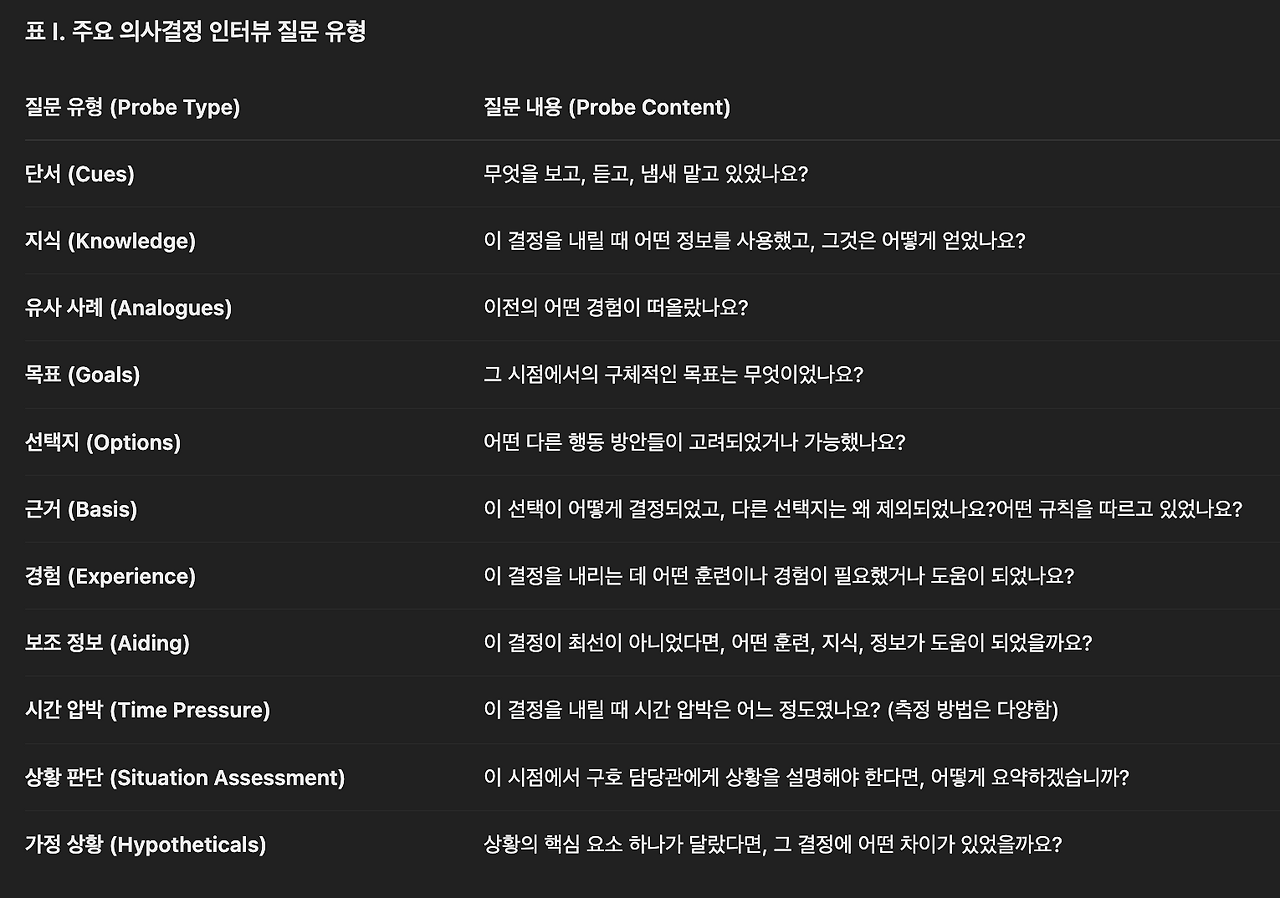 CDM은 전문가의 판단 과정을 하나하나 되짚으며, 직관 뒤에 숨어 있는 경험과 논리를 분석하는 기법입니다. RPD 모델이 전문가의 머릿속에서 일어나는 일을 설명한다면, CDM은 그 과정을 설명하게 만드는 방법에 가깝습니다. 감, 혹은 노하우라고 부르는 것의 실체를 드러내는 방법이죠.
