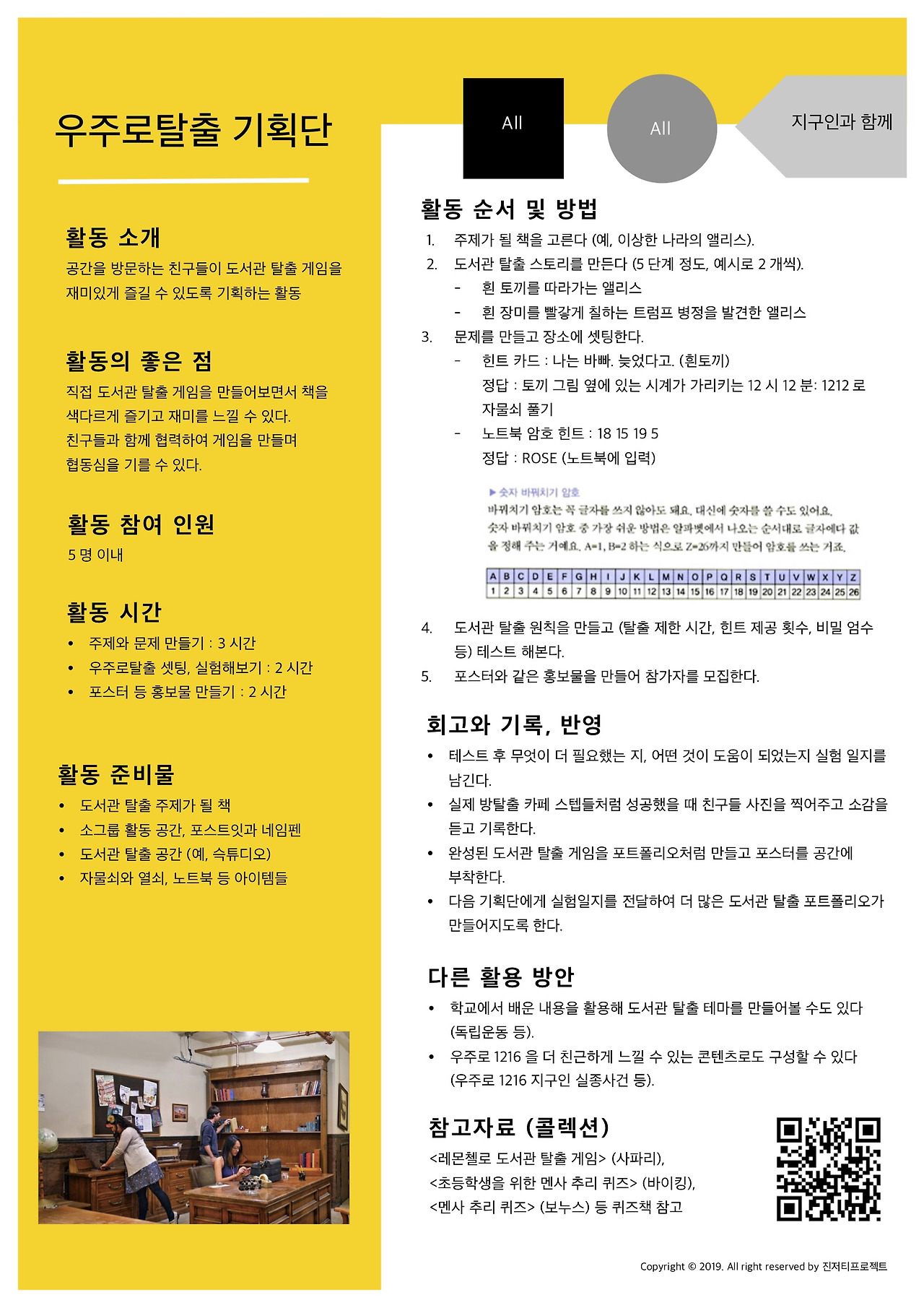 우주로 1216 탈출 게임을 우주로1216의 시그니처 프로그램으로 선정하고 우주인들과 함께할 기획단 활동을 준비하는 과정에서 4-5년 전 미국의 트윈세대들에게 큰 인기를 얻었으며 영화로도 제작된 <레몬첼로 도서관 탈출 게임> 도서에서 영감과 힌트를 얻었습니다.