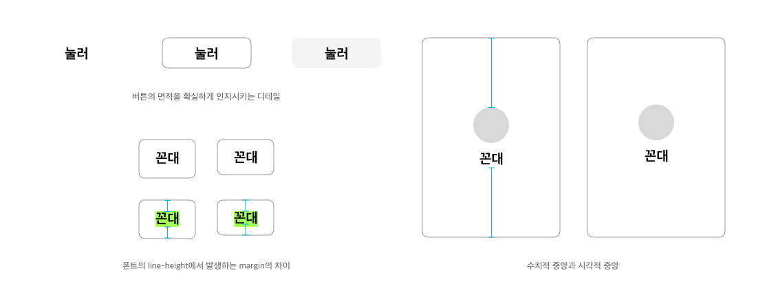 유저가 차이를 구분하기 어려운 디테일이라면, 그것에 어떤 의미가 있는지 간단하고 쉽게 설명할 수 있어야 한다. 수치로는 정확한 중앙이지만 시각적으로 중앙이 아닌 경우가 있다. 이럴 때에는 시각적 중앙을 맞추기 위해 미러링 된 화면을 보면서 조정을 한다. 반드시 해야 하는 우선순위 높은 작업은 아니지만 ‘이유 있는 디테일’이라고 할 수 있다.